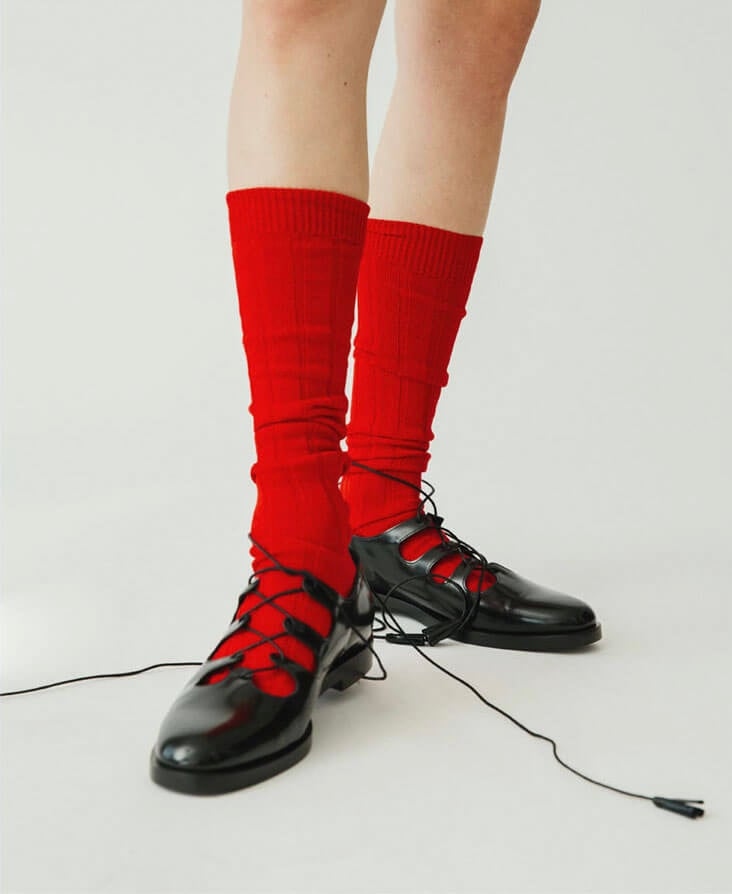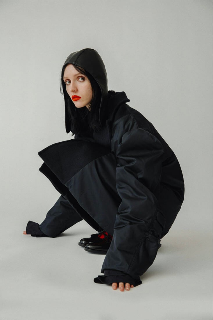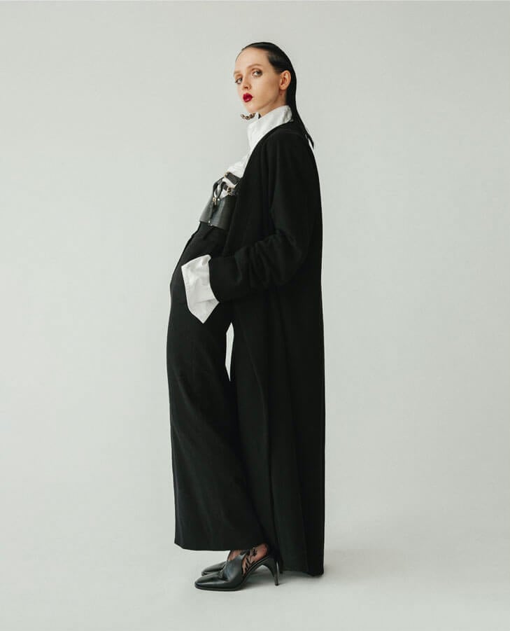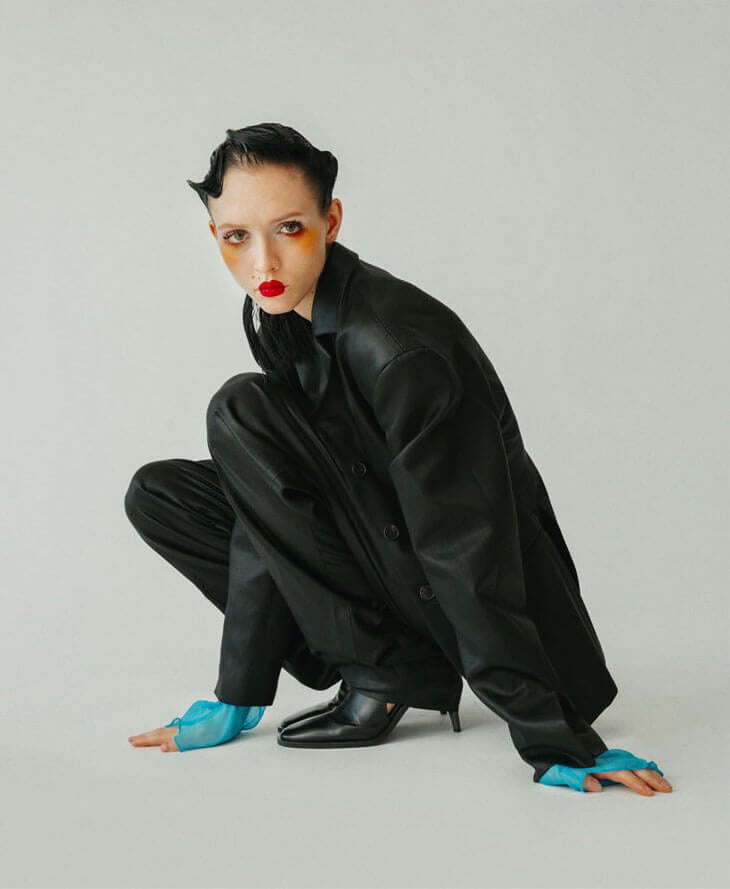 スタイリングはメイクとコントラストを描くように取り入れており、主に黒色のアイテムを使用し、僅かに赤色をポイントで添えています。