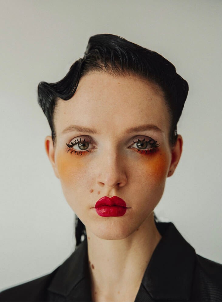 メイクは磁気人形にインスパイアされており、長めのアイラッシュ、発色の良いチークとリップカラーは人形の表情を真似しています。
