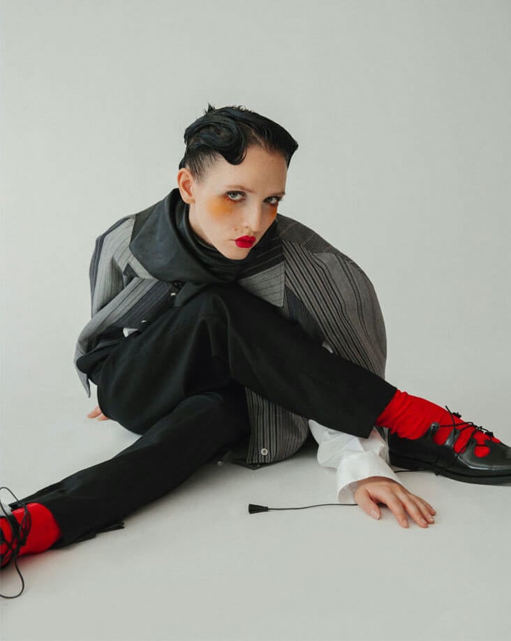 jacket by MRZ, shirt and trousers by VIVIENNE WESTWOOD, socks by BRESCIANI, shoes by MAX MARA, scarf by ADELBEL