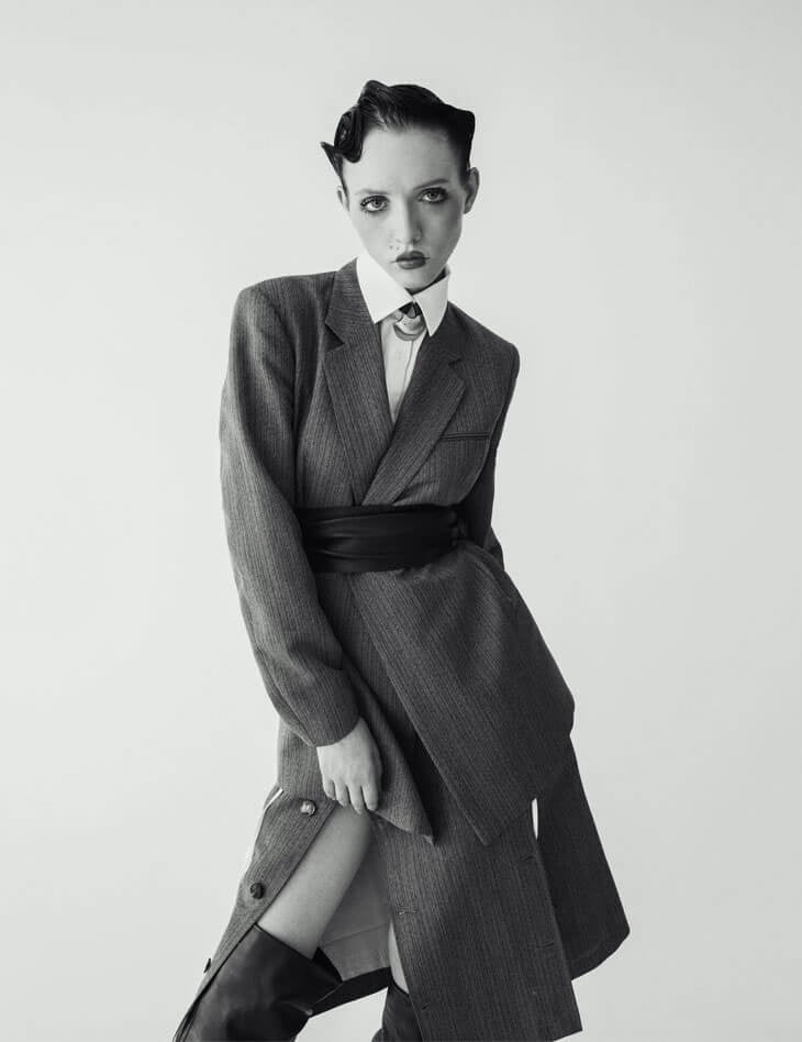 jacket and skirt by SABATO RUSSO, earrings by ACNE STUDIOS, belt stylist’s own