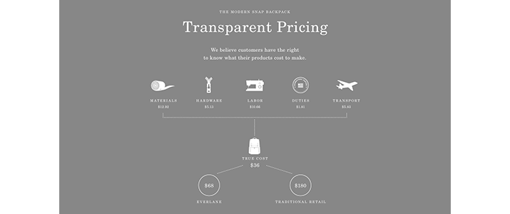 その言葉通り、原価だけではなくその構成要素もすべて公開している。材料費・労働費・関税・輸送費等の内訳や製造工場の詳細をEC上から簡単に見ることが出来るのだ。ほとんどのアパレルブランドは明かしていない情報だが、あえて逆のことを行うことでブランドアイデンティを広く認知させることに成功した。