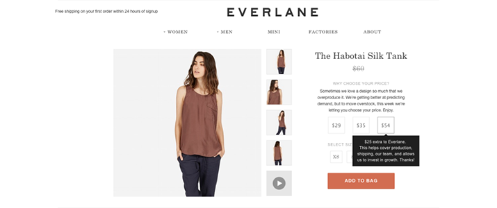 ↑ セール商品の詳細ページ。値段の上をホバーする度に異なるメッセージが出現する。最安値では「Everlane の利益は0円。製造費と物流費のみ含んだ値段です。」最も高い値段では「製造費や物流費のみならず、私達が成長する為の資金も含んでいます。ありがとう!」