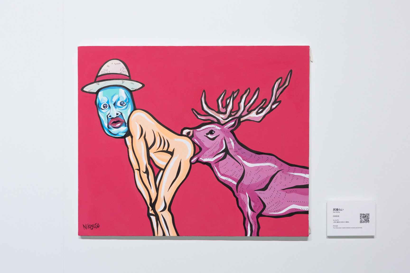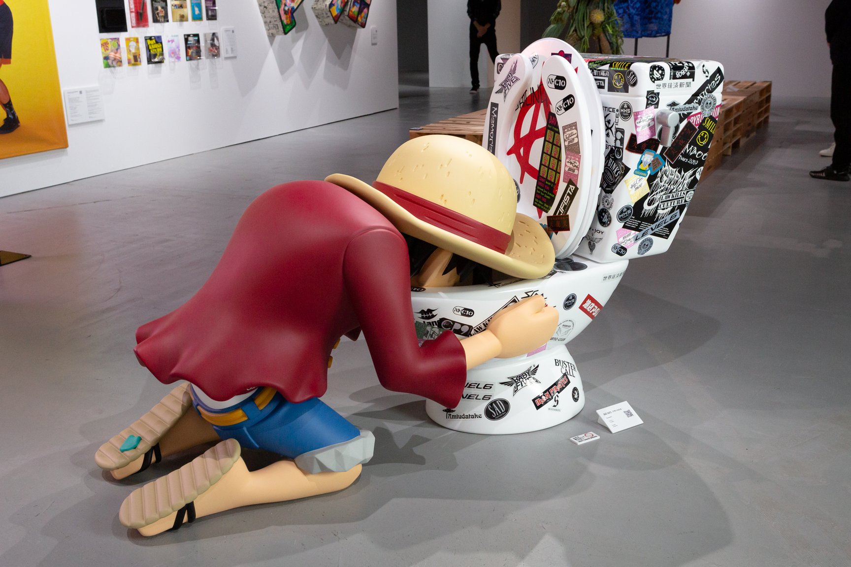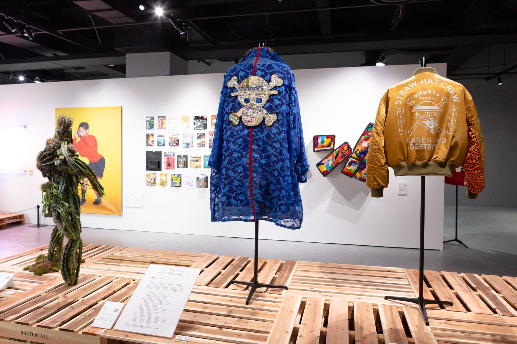 今回の展覧会は作中のセリフから「受け継がれる意志 人の夢 時代のうねり 人が『自由』の答えを求める限りそれらは決して止まらない」をテーマに掲げ、200組のアーティストが漫画やアニメ、グッズなどワンピースにまつわる要素を落とし込んだ作品を展示。「絵画」「ムービー」「オブジェクト」「アパレル」を通じて、ワンピースの新しい世界観を発信する。会場には山本寛斎の生前最後のアート作品をはじめ、野性爆弾くっきーのCOOKIE名義による人間と動物の本来の力関係を描いた「尻喰らい」や、格闘家の朝倉未来の絵画「闇とゴムの戦い」などが並ぶ。山本の作品は「ひとつなぎの大秘宝(ワンピース)」を手に入れた主人公のモンキー・D・ルフィが着ているコートをイメージし、世界中から集めた素材の端切れを繋ぎ合わせて制作された。このほか、アーティストのMAGDRONとタトゥアーティストの鎌田めぐむが手掛けるブランド「ブラックウィドー(BLACK WEIRDOS)」が製作したMA-1(8万3600円)や、SNSを中心に活動するアーティスト「Bustaskill」のスカーフ(1万9800円)など一部アイテムはグッズとして販売する。