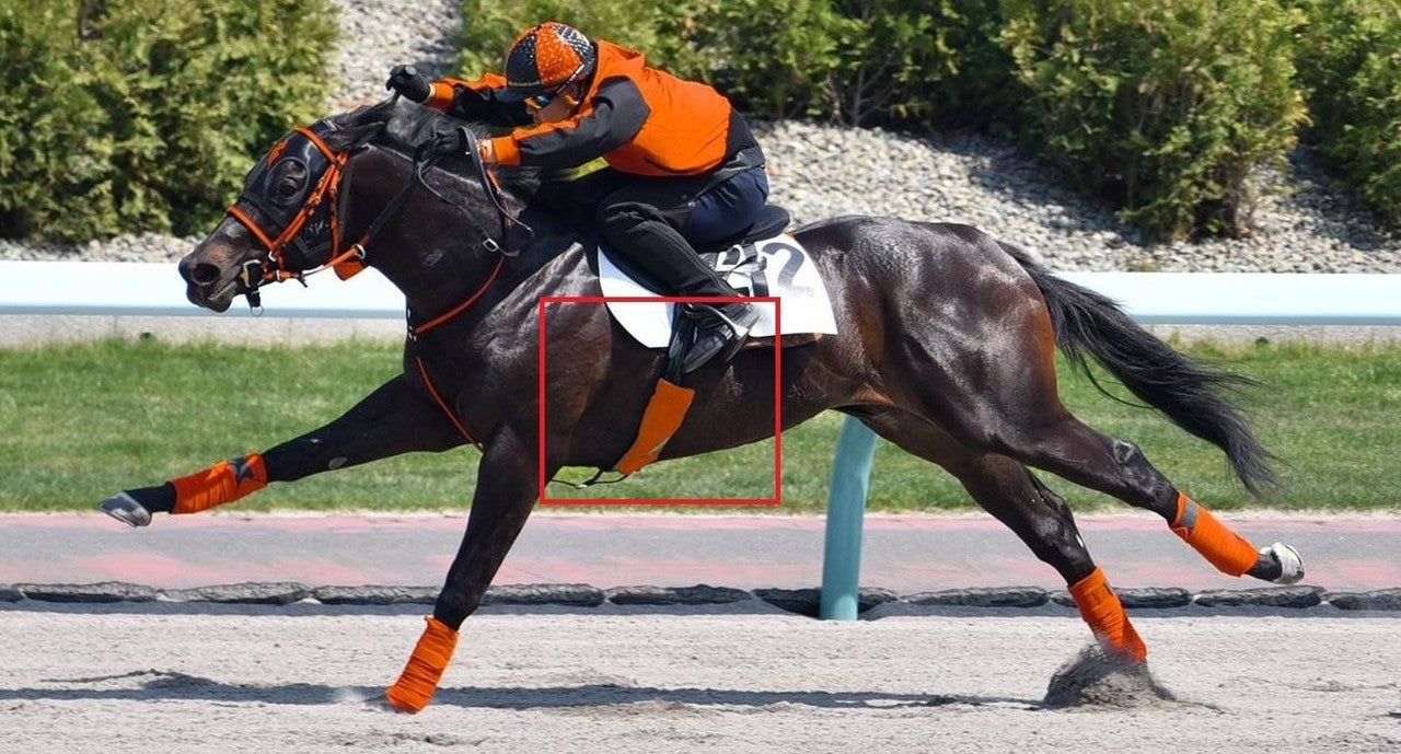 「Horsecall™」の心拍数計測用腹帯カバーを装着した競走馬