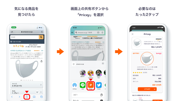 「Pricey」は、「アプリを開かずに使える価格比較アプリ」として開発された。同アプリをインストールしたユーザーは、ショッピングアプリやブラウザ上で気になる商品を探す。欲しい商品が見つかったら、「共有機能」のボタンをタップして「Pricey」を選択。その商品が安く買えるECサイトを、「Pricey」がレコメンドしてくれるという。