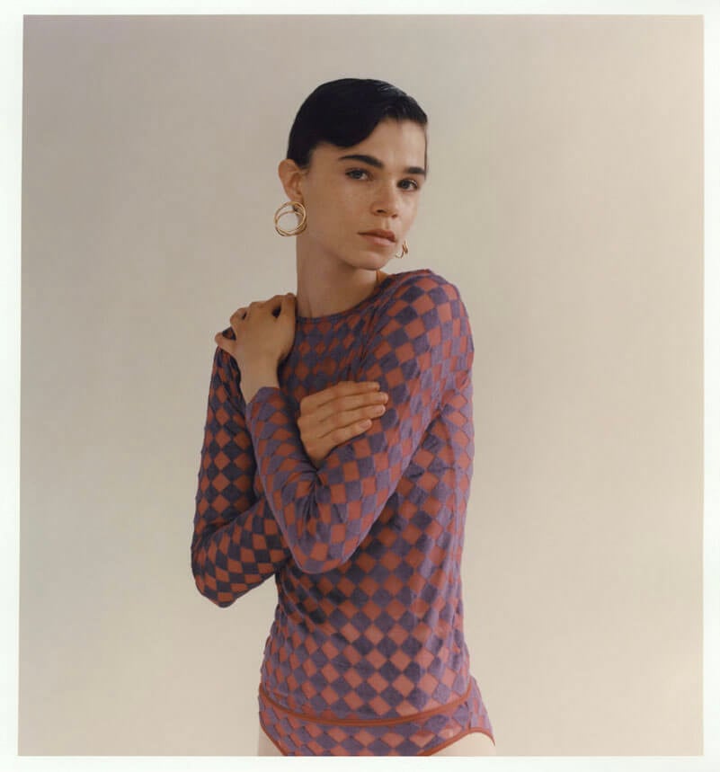 top and shorts by BASERANGE, tights by JONATHAN ASTON, earrings by COMPLETEDWORKS