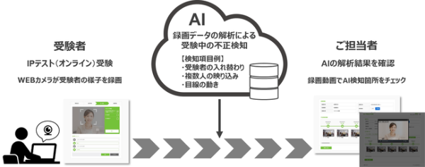 「AI監視サービス」は、受験前に本人の顔と本人確認書類を撮影したあと試験中の受験者の様子を動画で録画する。この動画をAIが解析し「受験者の入れ替わり」「複数人の映り込み」「不正の可能性が高い目線の動き」などを検知。