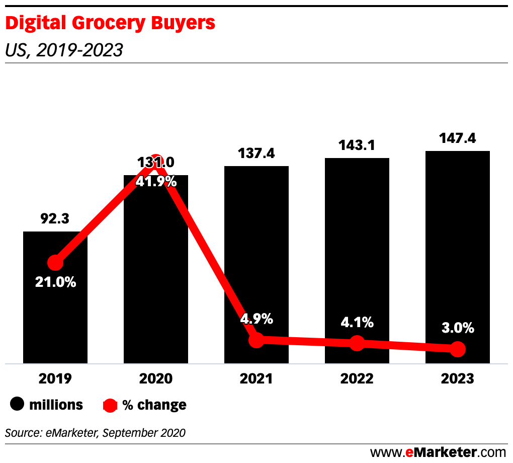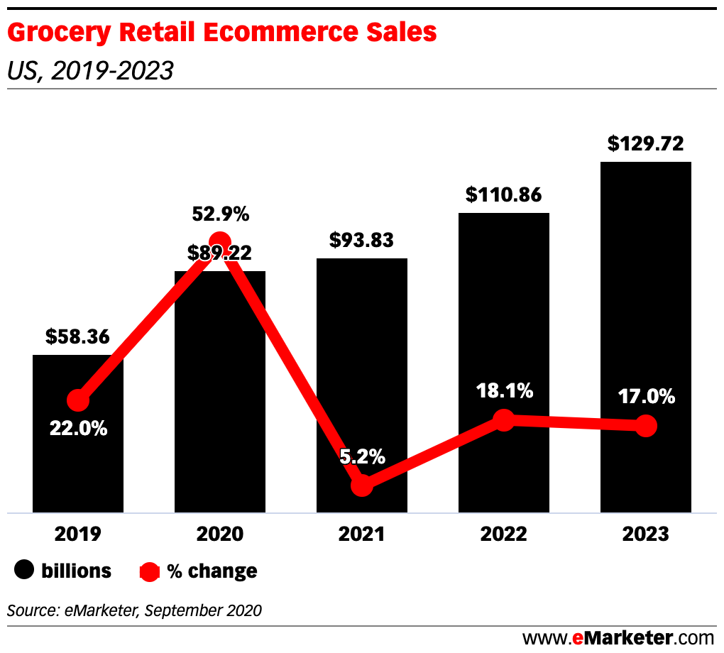 デジタルマーケティング調査企業のeマーケッターが最近行った調査でネットスーパーは今年、892.2億ドル(約9.3兆円)市場になるとの試算。308.6億ドルの前年から実に53%の伸びとなっている。ネットスーパー市場は2023年、1,297.2億ドル(約13.5兆円)にもなり食品売上全体の10%に達すると予測されている。