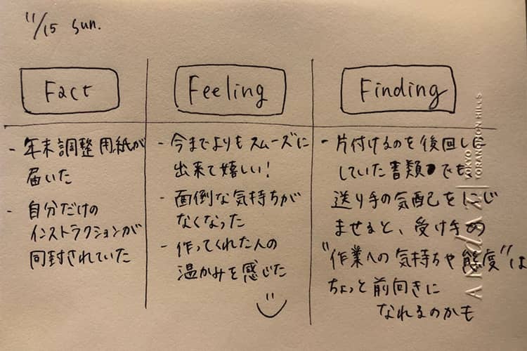 筆者が実施しているのは毎晩3Fメモを書くことだ。3FとはFact(出来事)、Feeling(感じたこと)、Finding(気づき)の頭文字をとったもので、弊社のデザインリサーチャーお手製のネーミングであるが、書き残すことが明確で実施しやすいのでお勧めしたい。