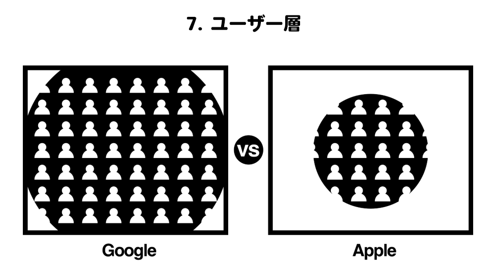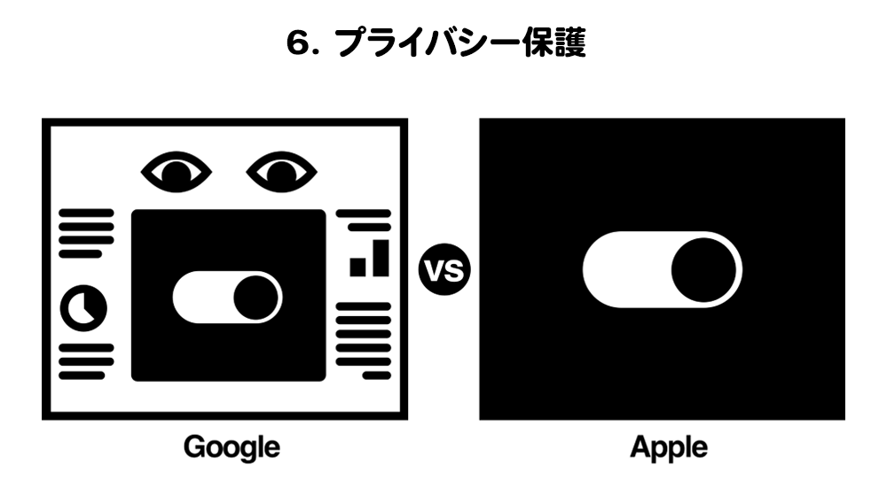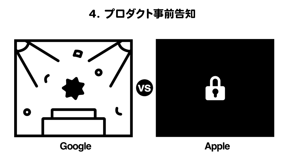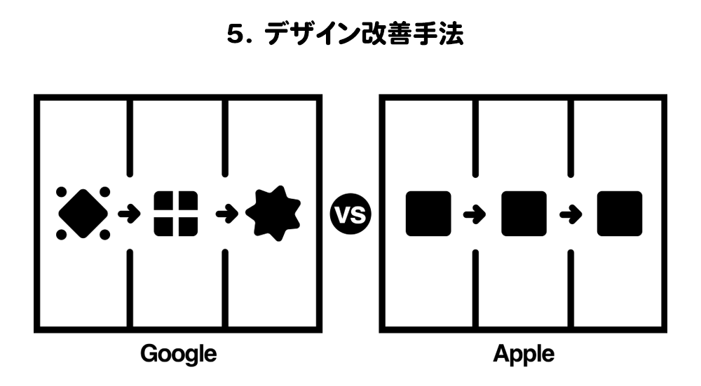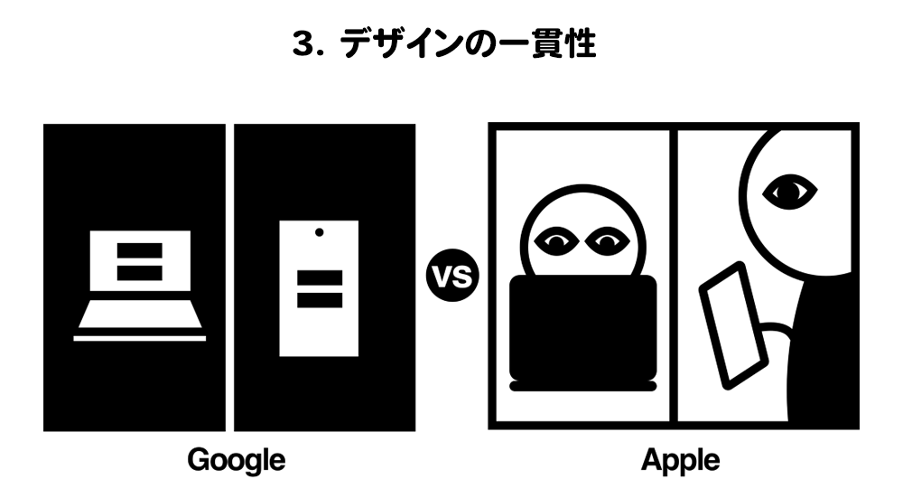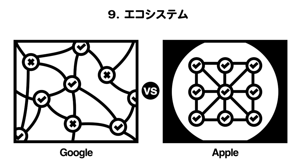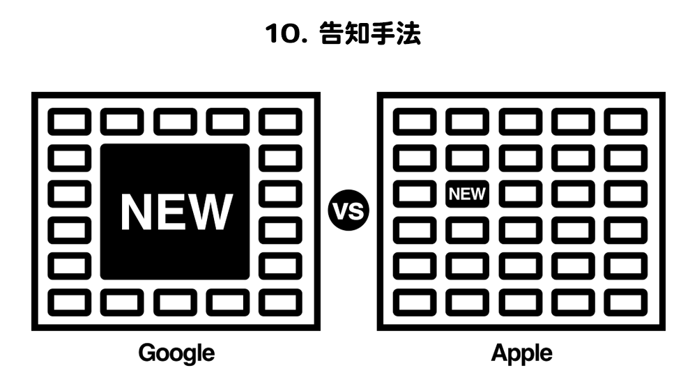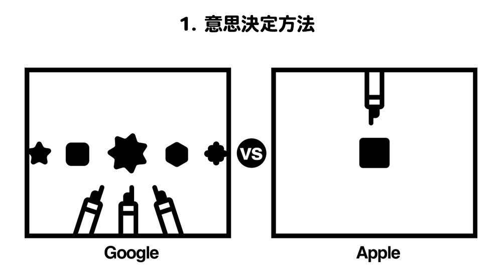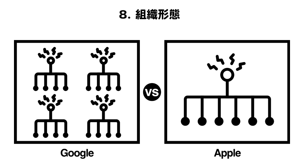 GoogleとAppleにおけるデザイン、組織、カルチャー、マーケティングなど10の項目に対してのアプローチの違いを画像で表現してみた。