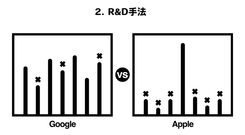 一方、Googleは事前のリサーチよりも、利用しているユーザーの反応を元にプロダクトの検証を行う傾向がある。可能な限りオープンソース化を行い、コミュニティからの貢献やフィードバック元に評価を獲得している。
