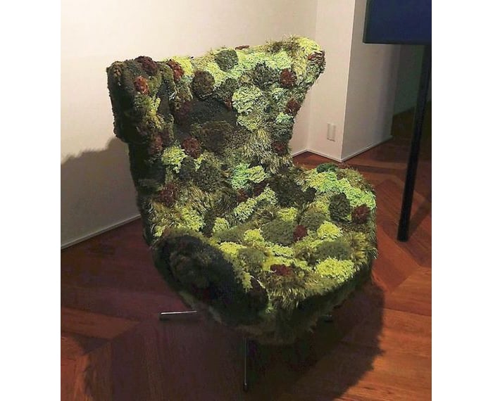 三原さんは、パイルをカットして模様を出す紋ビロード、漆を使った引箔、むら染めを掛け合わせて、風化して朽ち果てたような風合いに仕上げた。ロクさんは、緞帳(どんちょう)用途で手織りするつづれ織を生かし、「森を織る」イメージで表現。木々やコケが絡み合うふかふかのファブリックを作り、自然の心地良さを体感するような椅子に仕上げている。