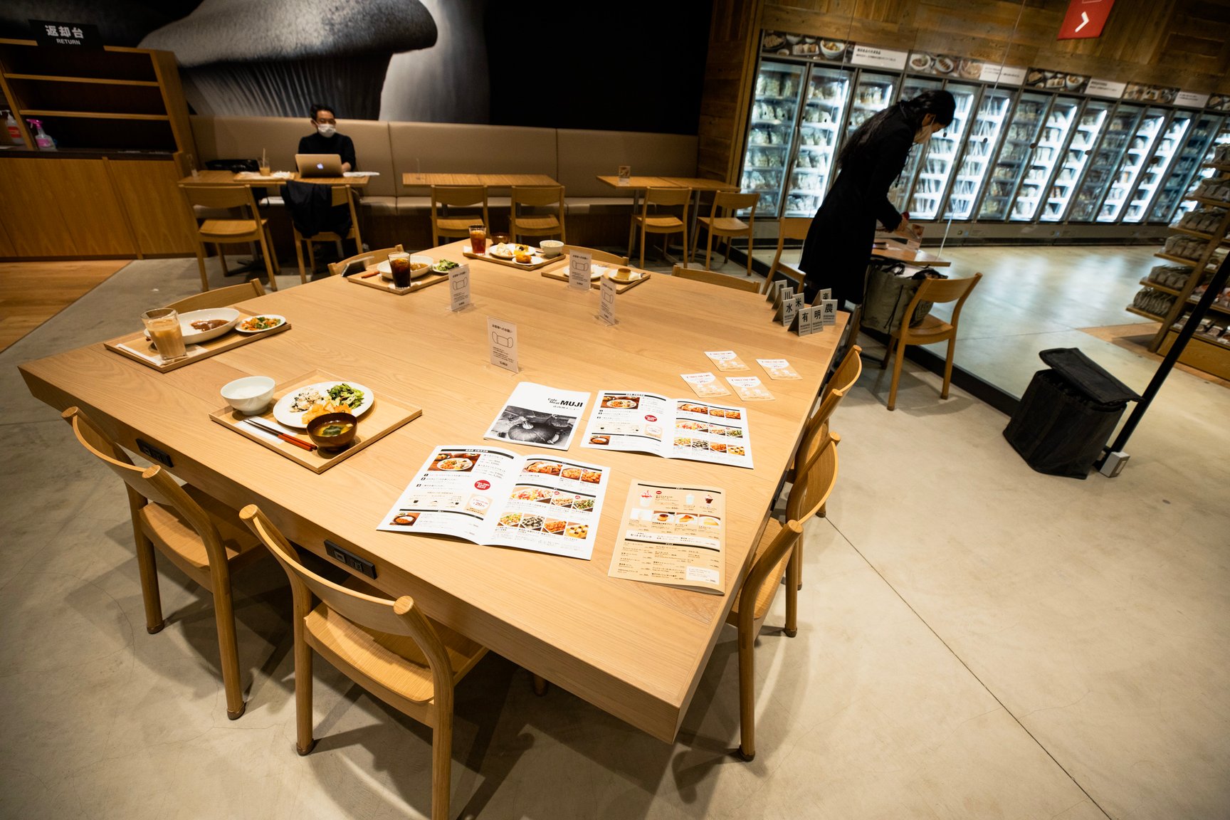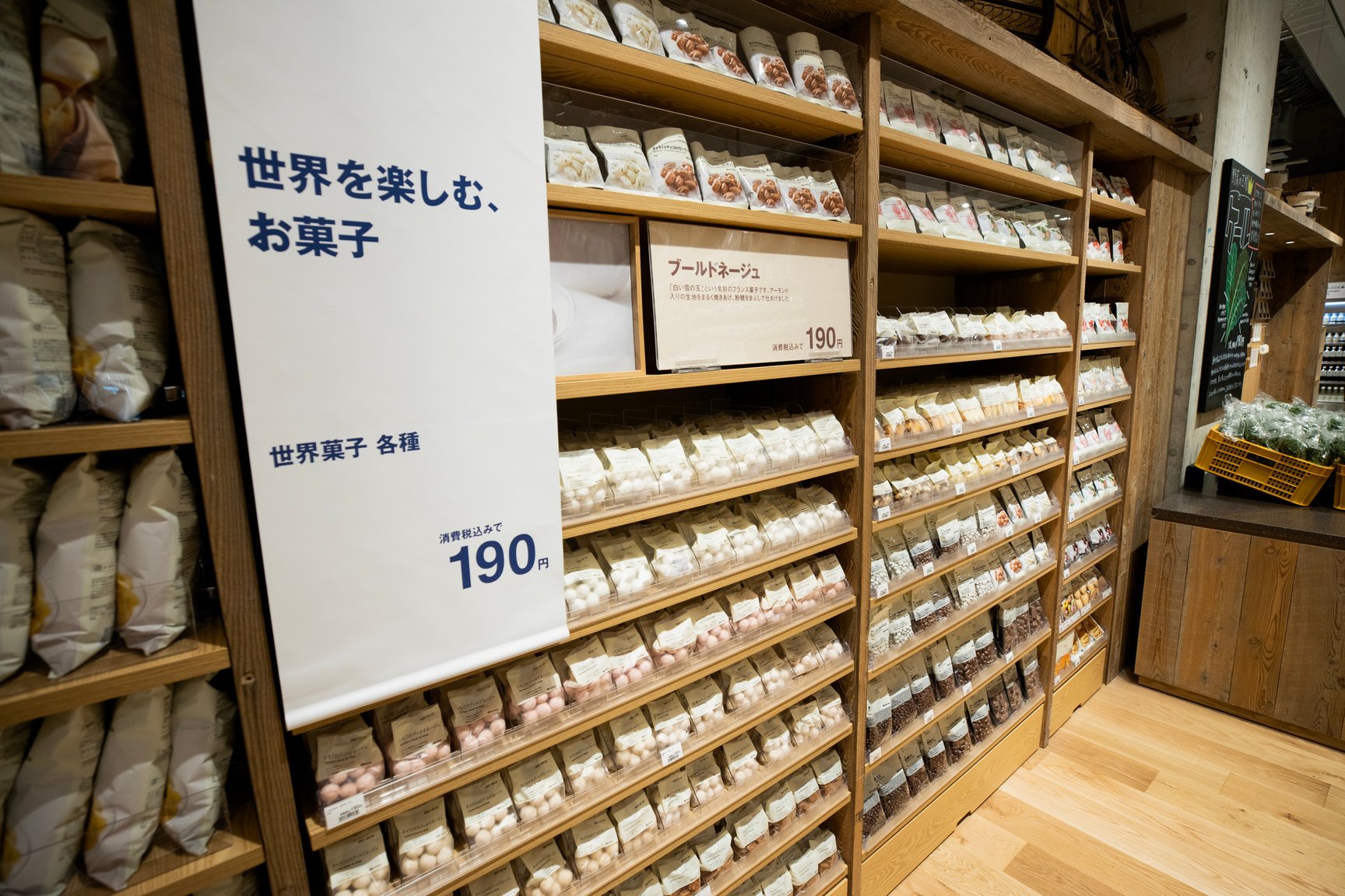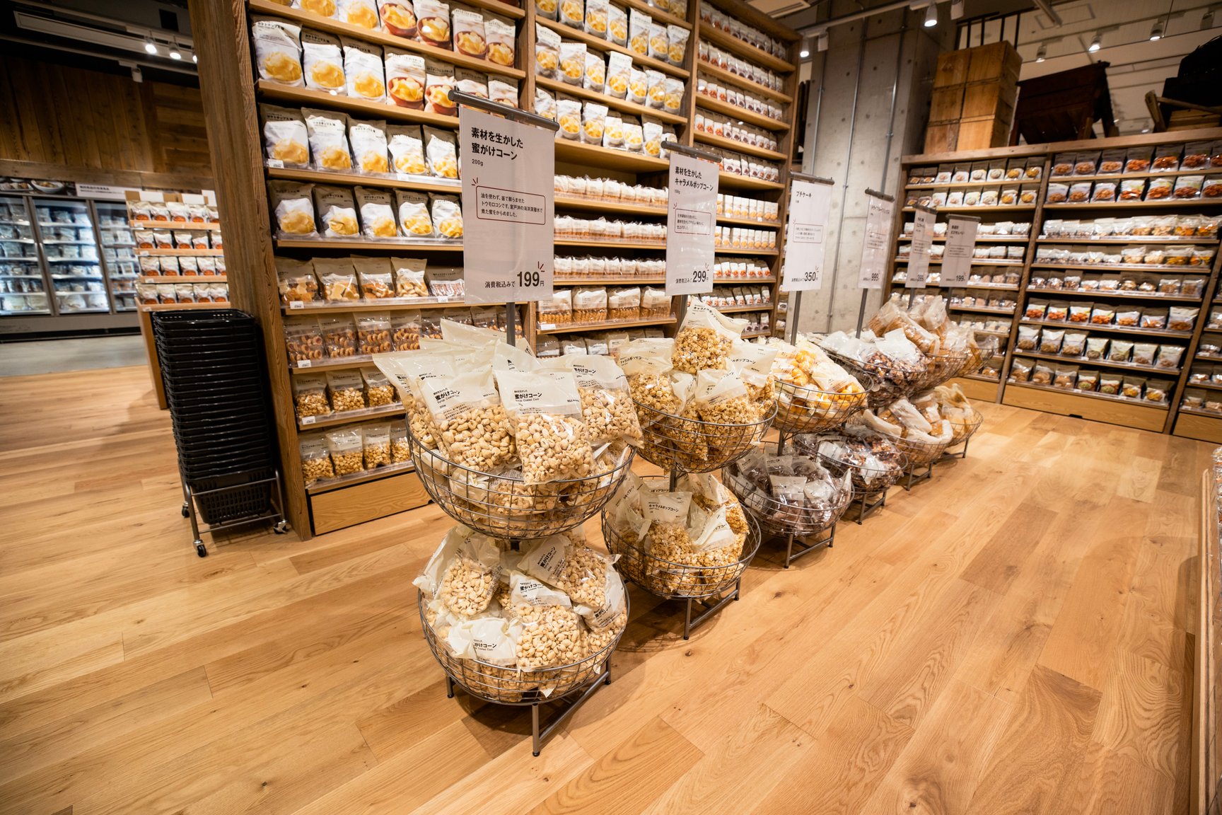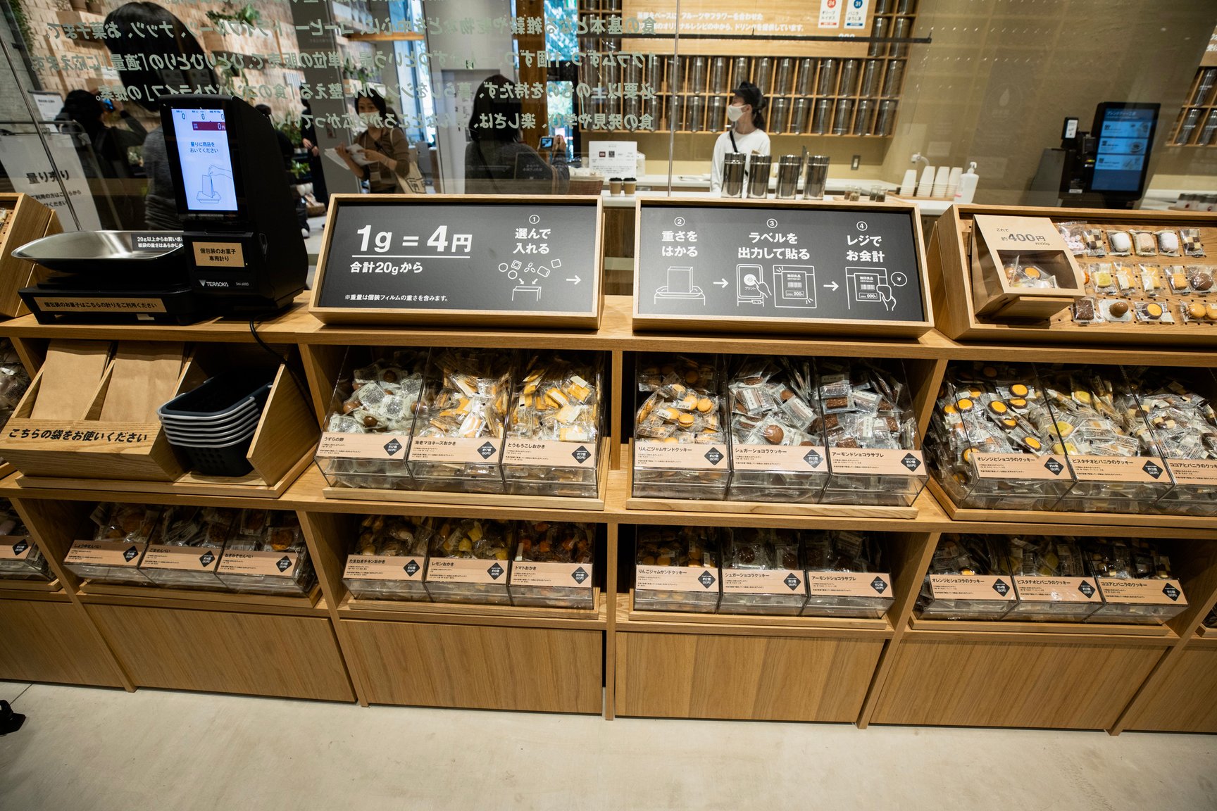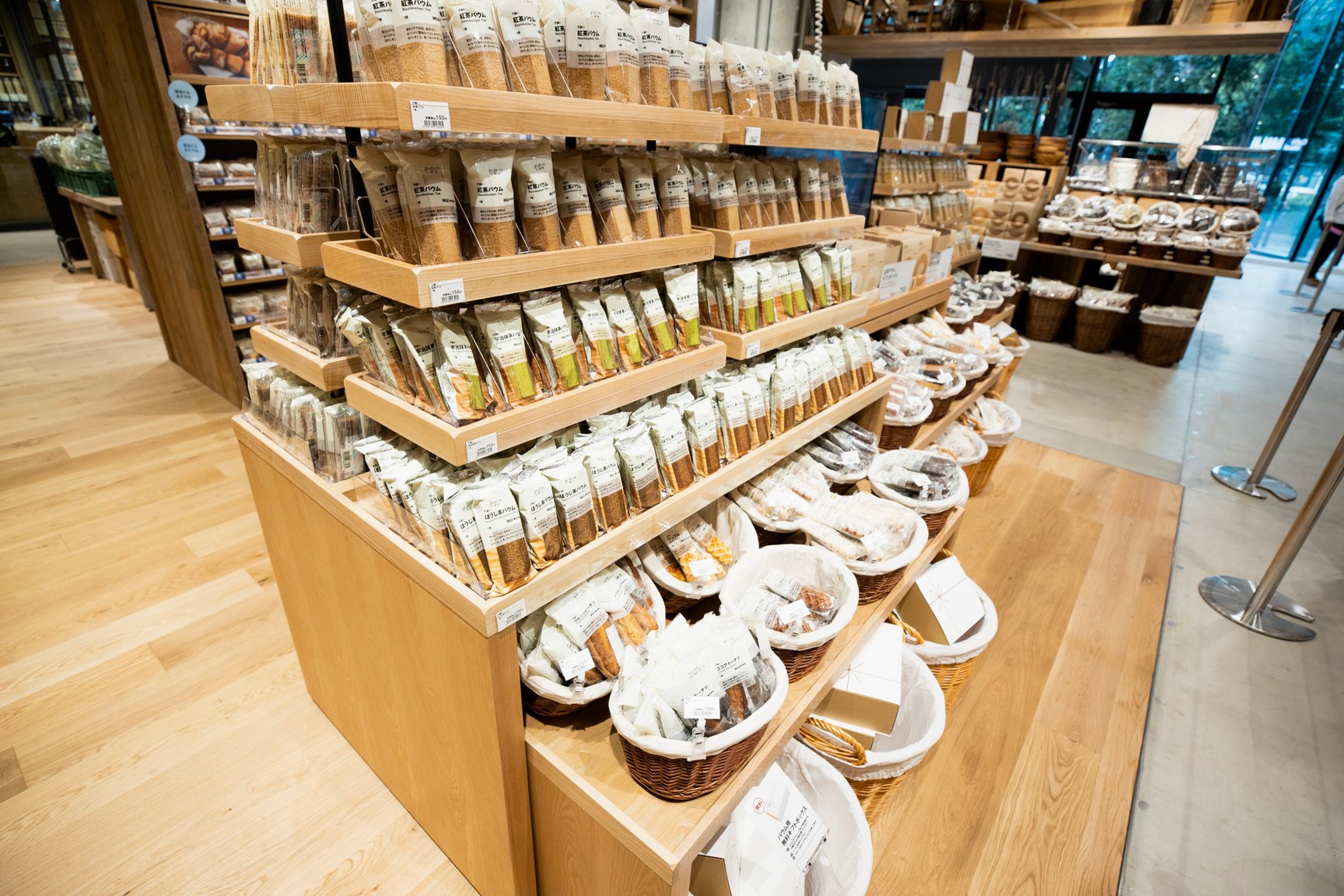 食に関する商品を集積した1階は、店内で焼いたパンを販売する「MUJI Bakery」やカフェ「Café&Meal MUJI」、旬の野菜と果物を使用したジュースを販売する「ジューススタンド」を用意するほか、菓子、コーヒー豆、雑穀、ナッツ、ドライフルーツといった50種類以上の食品を1gで4円、合計20gから販売する「食品の量り売り」、32種類の茶葉を必要な量だけ購入できる「ブレンドティー工房」を初めて展開。MUJI Bakeryでは東京有明限定でカレーパン(240円)を販売する。そのほか、冷凍食品や青果、飲料などを取り揃え、地域の人々の生活を食から支える暮らしの拠り所を目指す。