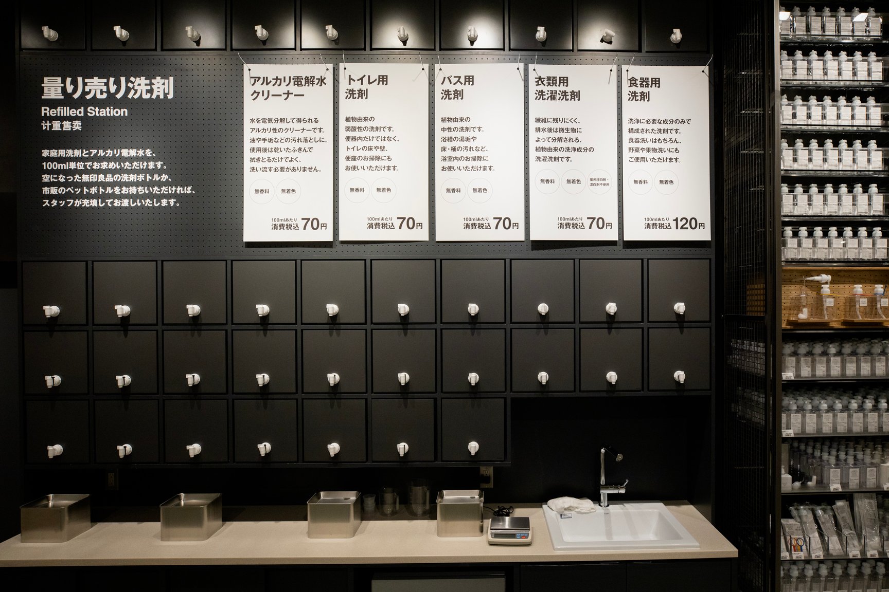 3階では衣料品を中心に化粧品や文房具など生活雑貨を展開。希望の長さに調整できるストールの量り売り(10cmで290円)や、空のペットボトルか無印良品の洗剤ボトルを持参することで「アルカリ電解水クリーナ」「トイレ用洗剤」「バス用洗剤」「衣類用洗剤」「食器用洗剤」「食器用洗剤」の5つの洗剤を100ml単位から購入できる洗剤の量り売りのスペースを設置する。別売で販売している詰め替え用の衣類用洗剤が500mlで390円に対して、量り売りでは100mlあたり70円と安価に設定した。また、資源が循環する社会を目指して、無印良品の商品に限らず不要な服を回収する「古着回収ステーション」を用意し、利用者には再生原料で製作した軍手を提供する。
