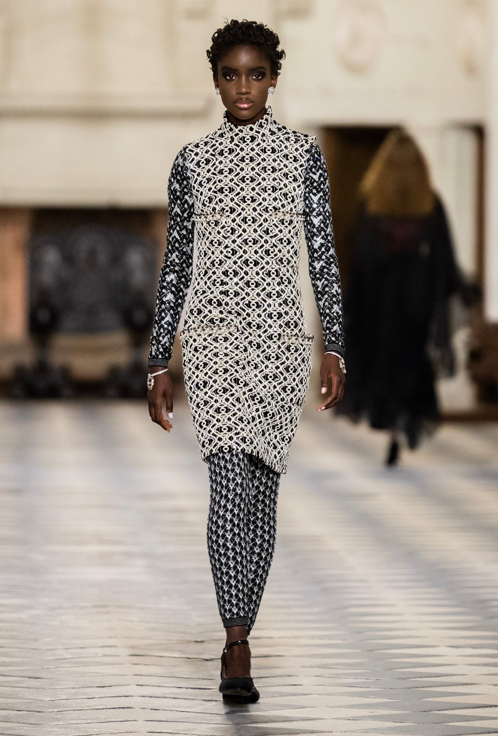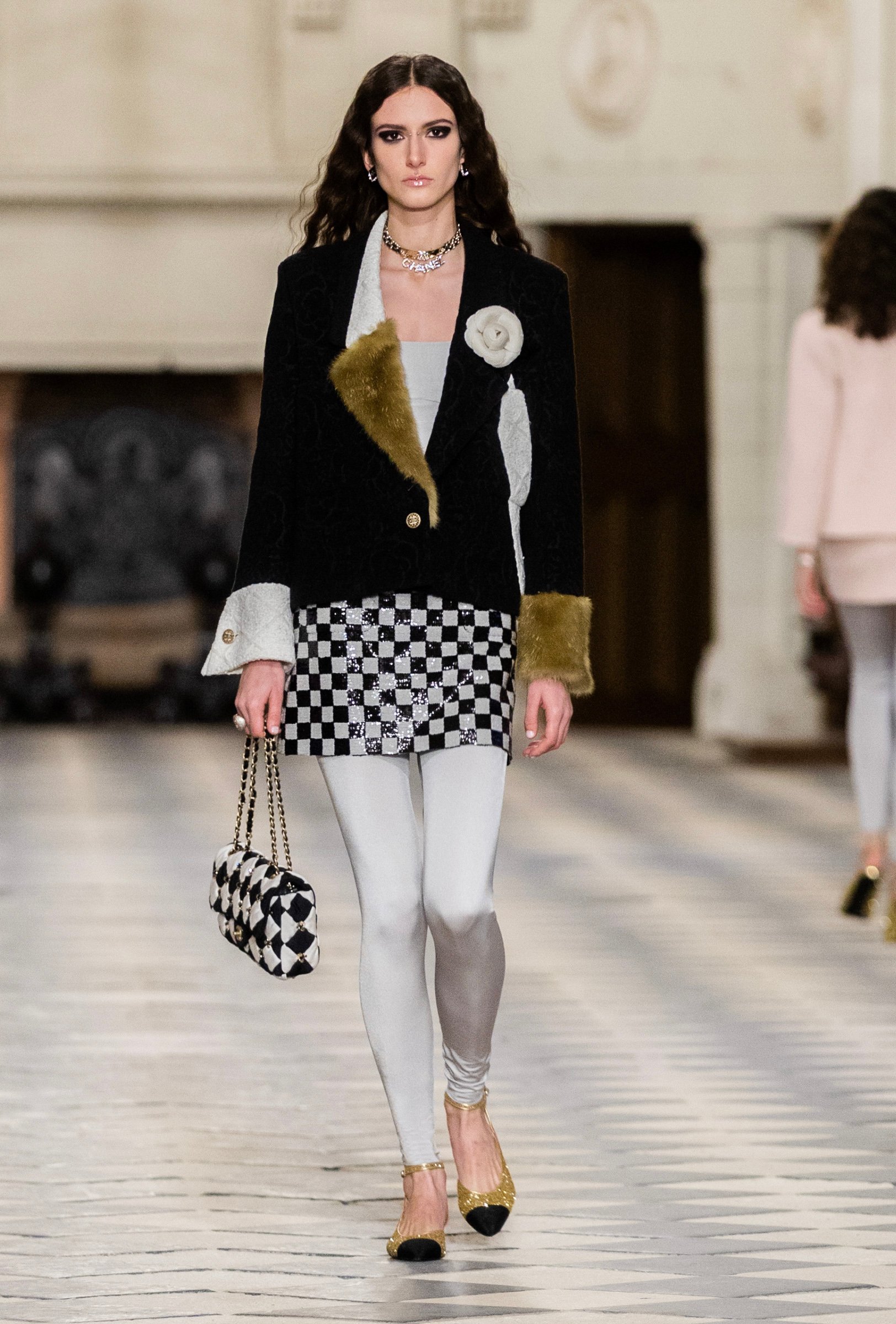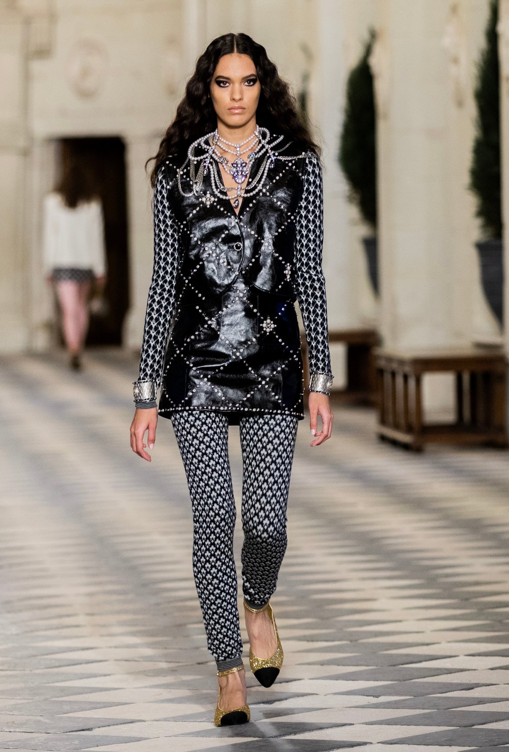 ショーが行われたのは、ブラックとホワイトの市松模様がフロアに描かれたグランド ギャラリー。市松模様は、スパンコールをあしらったミニスカートや、フリンジ加工のツイードをパッチワークしたロングスカートなどに取り入れられた。スポーティーな印象のレギンスやボディスーツを、クラシカルな素材と組み合わせたスタイリングが特徴。ツイードのボディスーツにブラックのベルベットのコートをまとったスタイルは、カトリーヌが夫のアンリ2世が亡くなった後、黒い服しか身に着けなかったことに由来するという。また、ツイードのケープの色調はタペストリーから、ジャケットのラペルにあしらわれた花の刺繍やニットの模様は庭園からインスピレーションを得た。ラスト3ルックは、ウエスト部分に城を模した刺繍が特徴。古城に刻まれた歴史を、シャネルのメティエダールアトリエによるクリエイティビティで表現している。