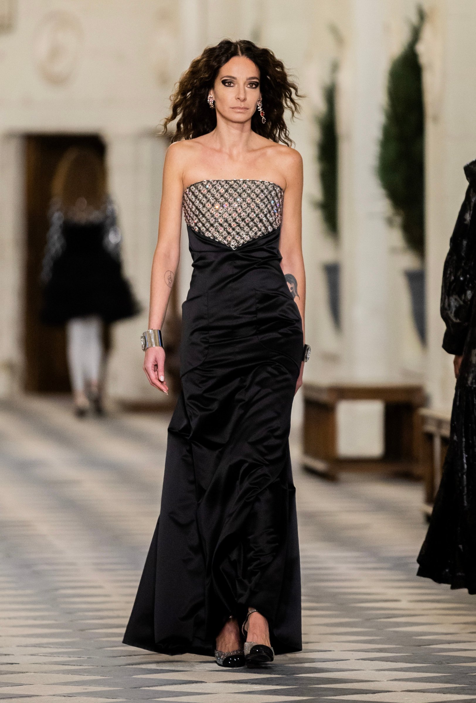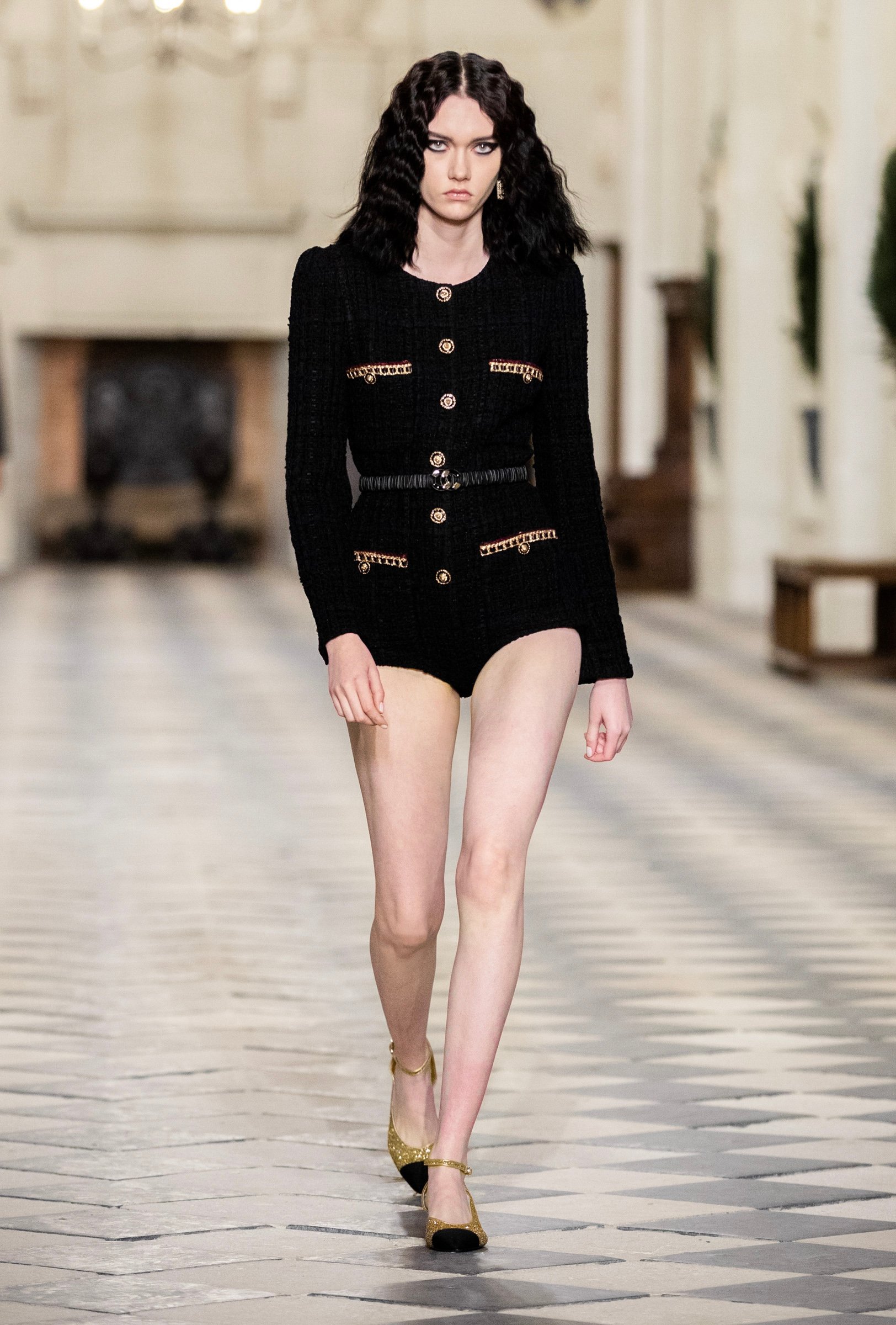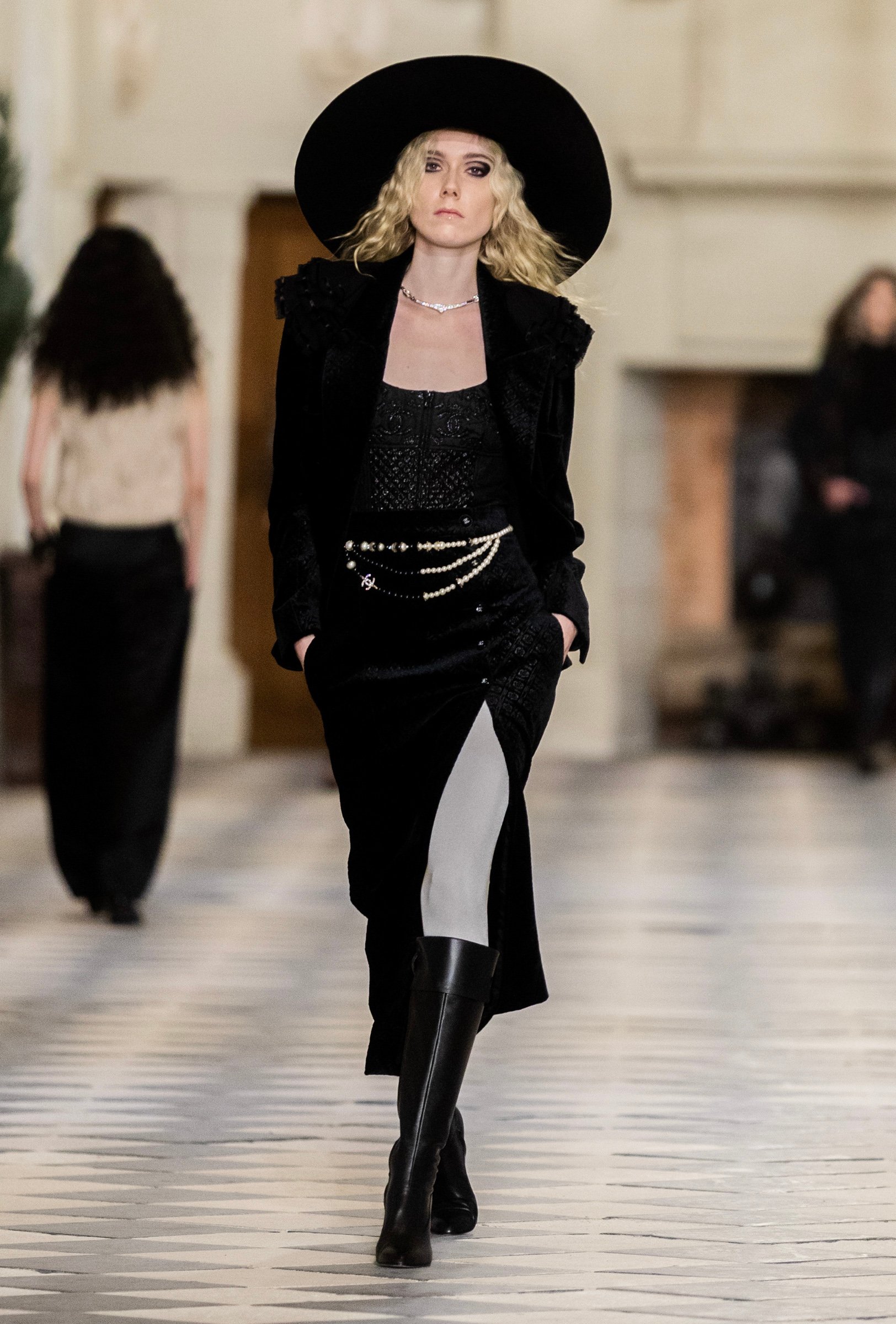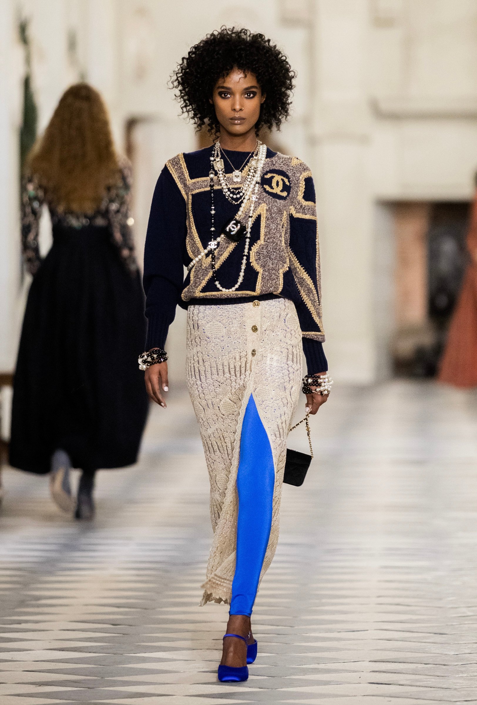 ショーが行われたのは、ブラックとホワイトの市松模様がフロアに描かれたグランド ギャラリー。市松模様は、スパンコールをあしらったミニスカートや、フリンジ加工のツイードをパッチワークしたロングスカートなどに取り入れられた。スポーティーな印象のレギンスやボディスーツを、クラシカルな素材と組み合わせたスタイリングが特徴。ツイードのボディスーツにブラックのベルベットのコートをまとったスタイルは、カトリーヌが夫のアンリ2世が亡くなった後、黒い服しか身に着けなかったことに由来するという。また、ツイードのケープの色調はタペストリーから、ジャケットのラペルにあしらわれた花の刺繍やニットの模様は庭園からインスピレーションを得た。ラスト3ルックは、ウエスト部分に城を模した刺繍が特徴。古城に刻まれた歴史を、シャネルのメティエダールアトリエによるクリエイティビティで表現している。