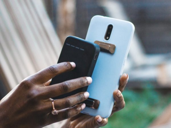 TEVOLTを使うにはまずスマホの背面にマグネットプレート2つを粘着テープでくっつける。すると、ワンタッチでTEVOLTを取り付けられるようになり、スマホと一体化させられる。