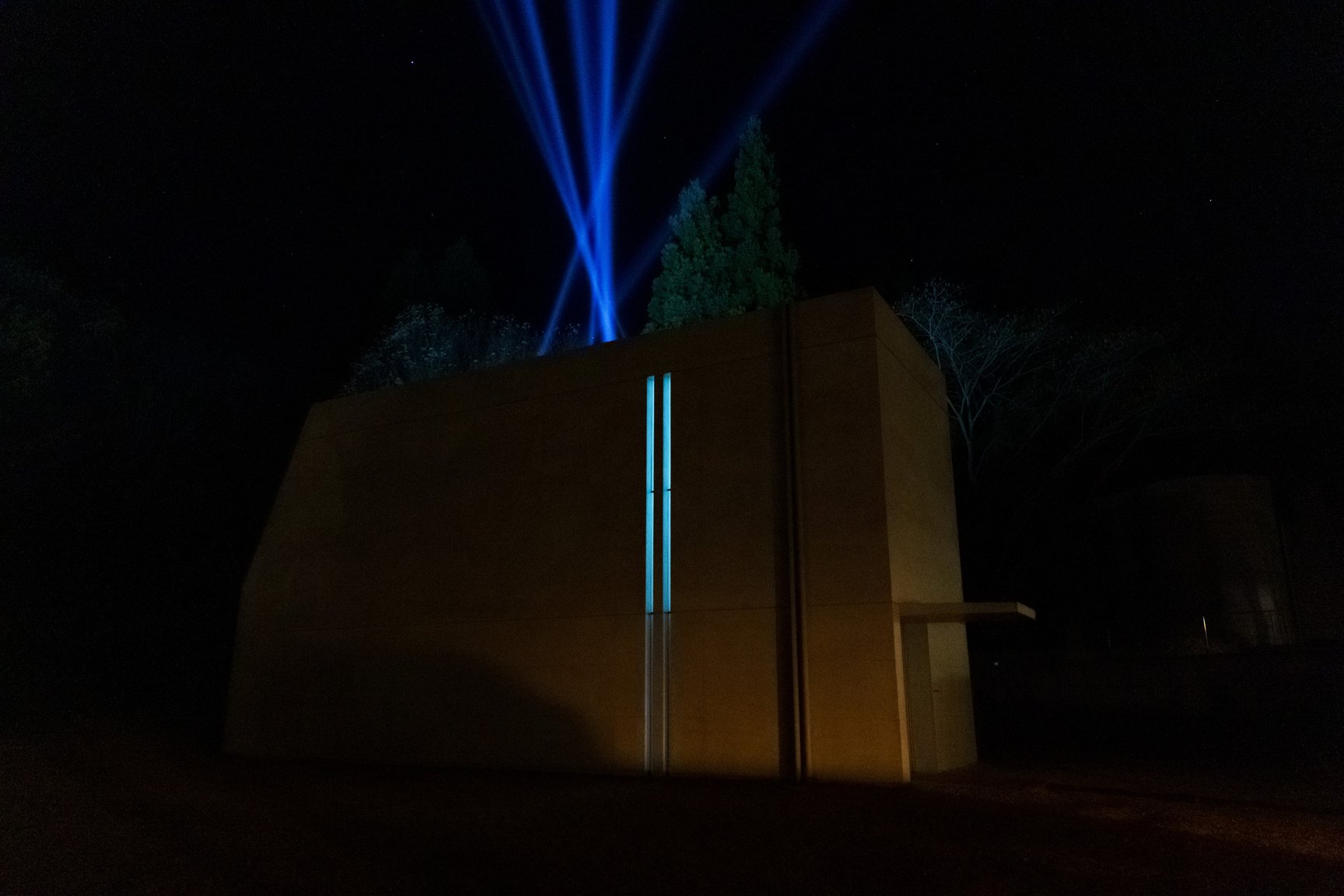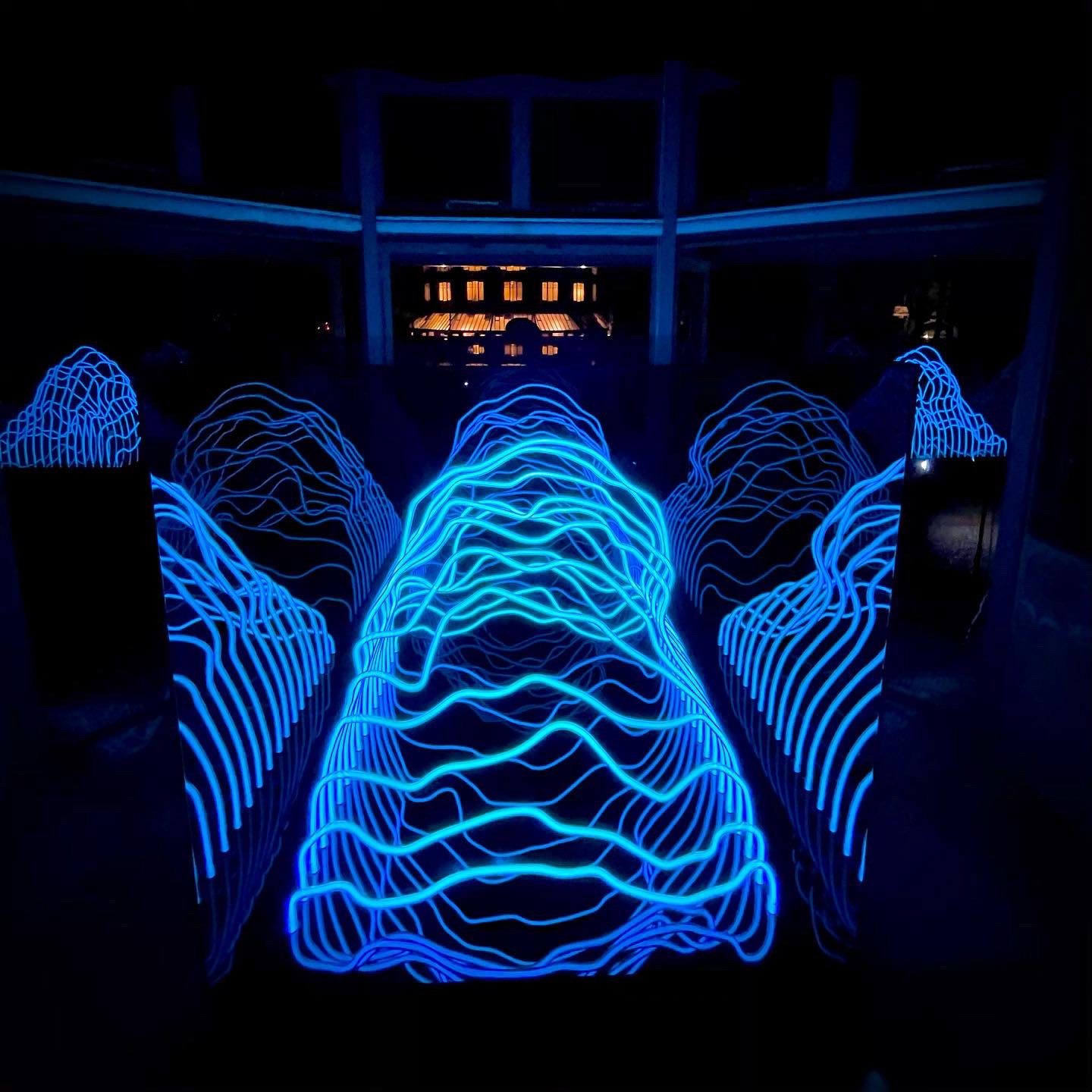 普段は白樺派の展示がメインの清春白樺美術館には脇田玲のデジタル作品が並び、安藤忠雄が「自然光だけの美術館を作りたい」と作った「光の美術館」は、建物そのものが真鍋大度(ライゾマティクスリサーチ)による"Critical line"という音と光の作品になっていた。時折、発せられる強い音と光は、ソフトウェアや人間のオペレーションでは作り出せないものを目指し、分散培養細胞の神経活動データを元にしたという。