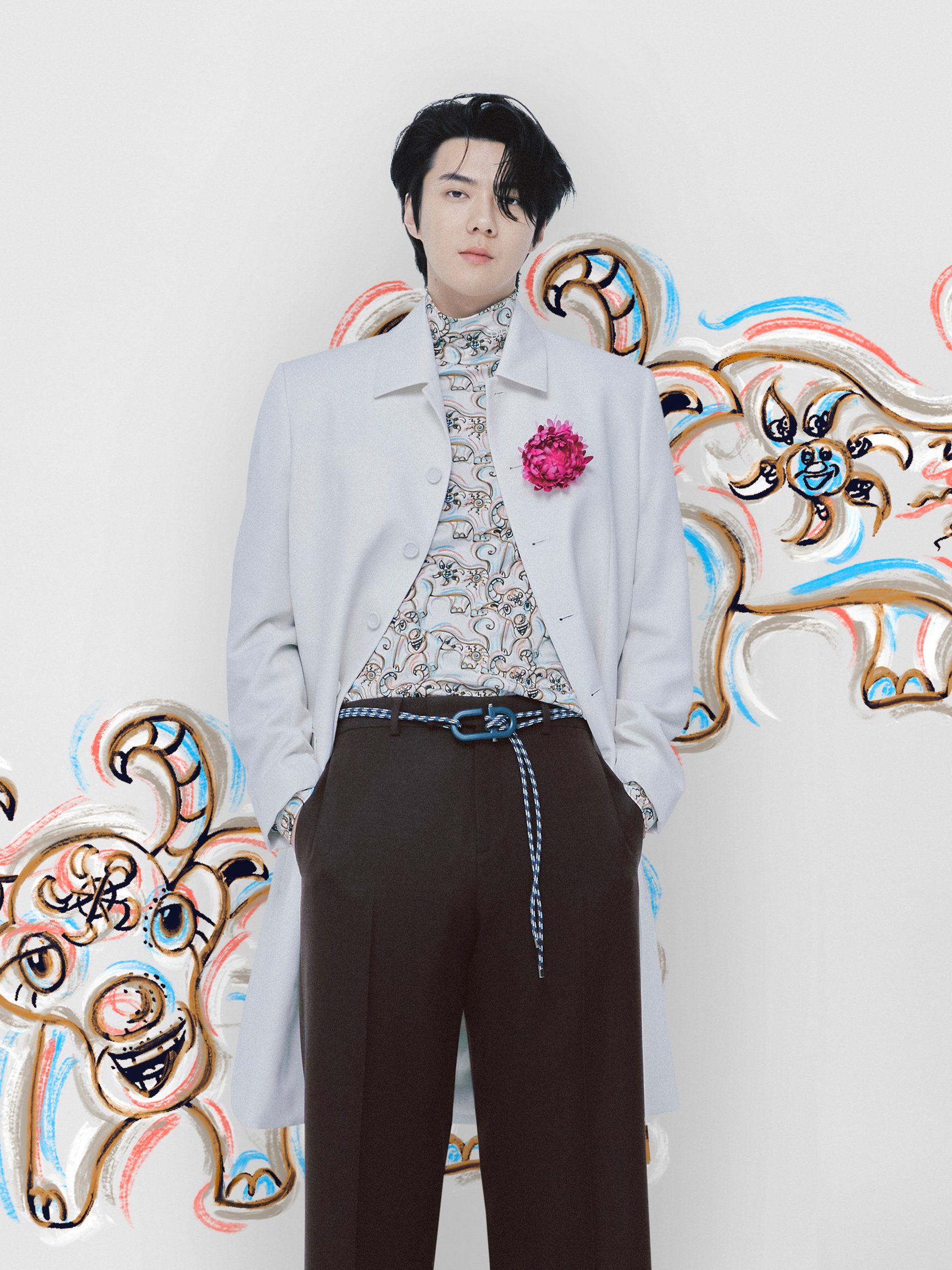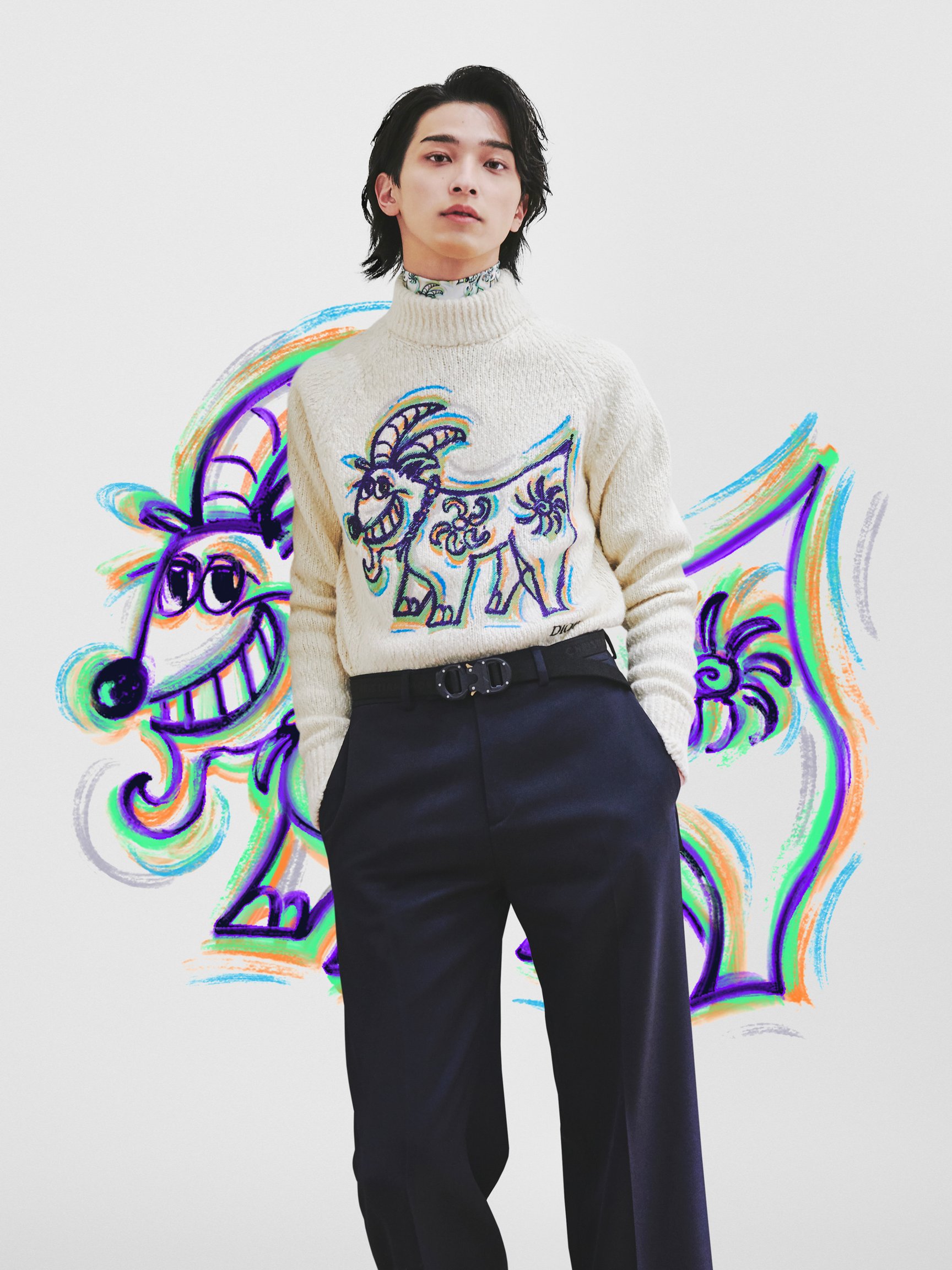 キム・ジョーンズは今回、伝統と革新を表現するコレクションにケニー・シャーフを起用。十二支を構成する動物のキャラクターのスケッチといったアーカイヴを元に、特別に作られた新シリーズをプリントや刺繍として用いた。また、インスピレーションとなった中国の技術と素材を取り入れている。
