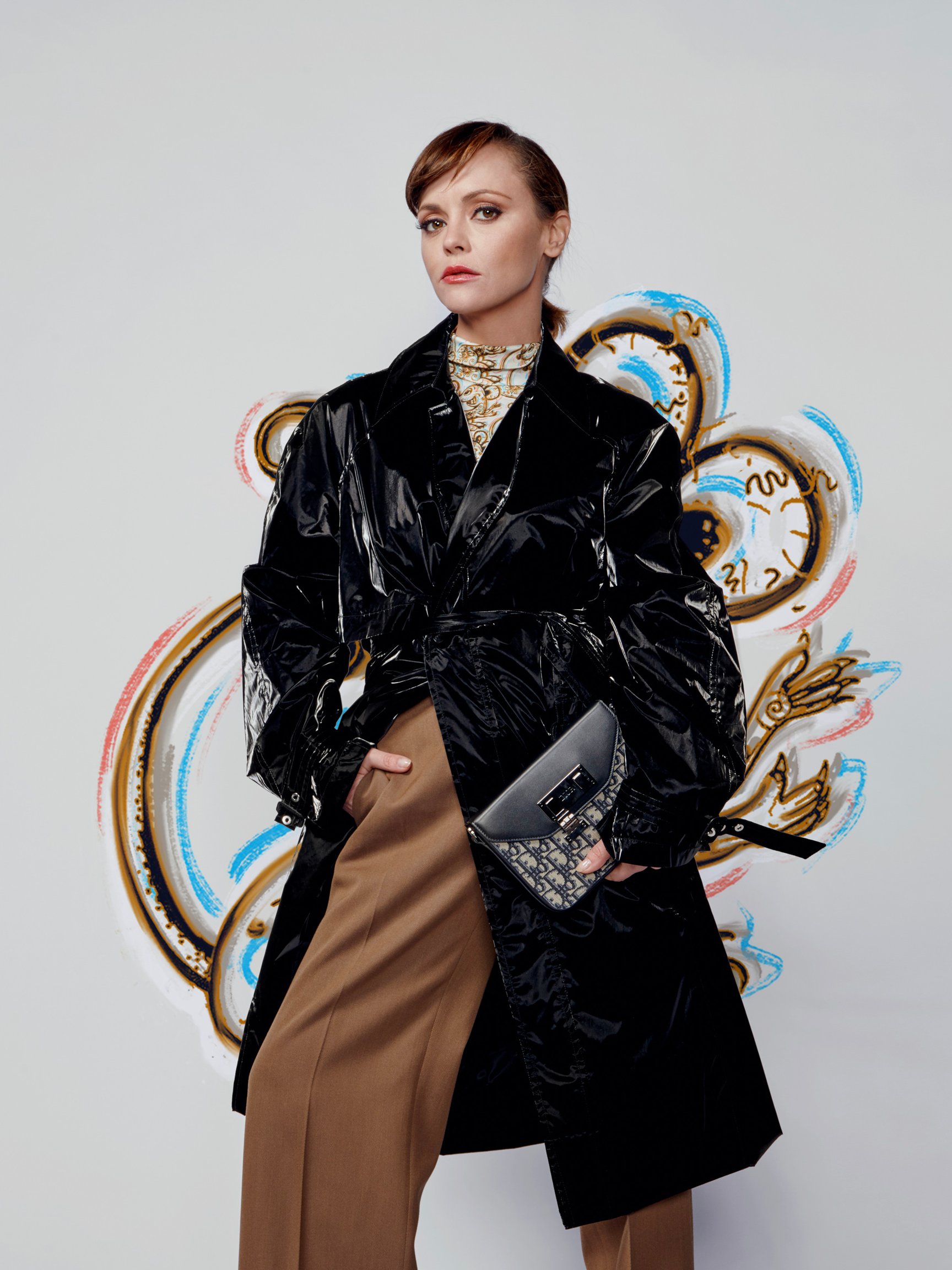 「テイラー オブリーク」のテーラードコートとシングルブレストのジャケットは、メゾンを象徴する「バー」ジャケットへのオマージュとしてベルトでウエストマーク。背中に大きなリボンを施したベルトはクラシカルでフェミニン。グラフィティのように鮮やかなプリントのシャツやニットが、ユニークな味付けとなっている。