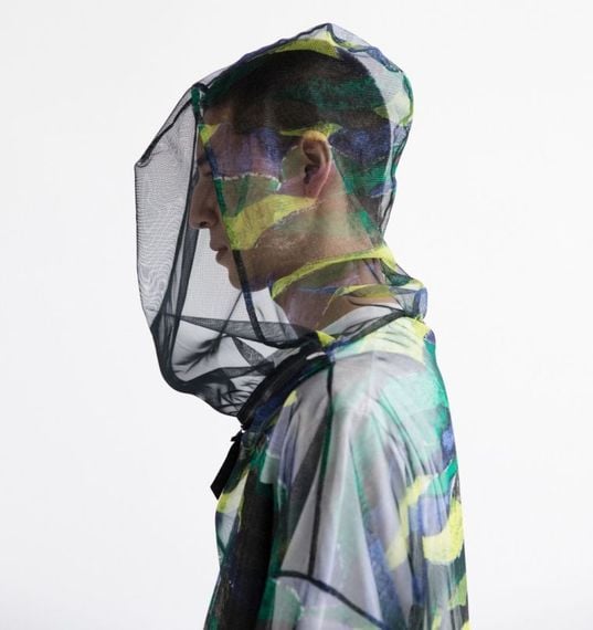 メッシュ地には山をイメージしたアーティスティックなオリジナル柄をプリントし、ブランドロゴも付く。最低限の道具で自然の中で過ごすブッシュクラフトや渓流釣りなど、虫に悩まされやすいアウトドアアクティビティーに向いている一品だ。専用の小袋も付いており、使わないときはコンパクトに収納できる。3万2000円。