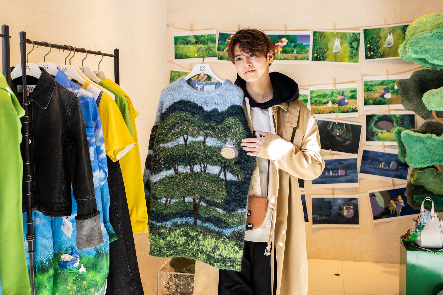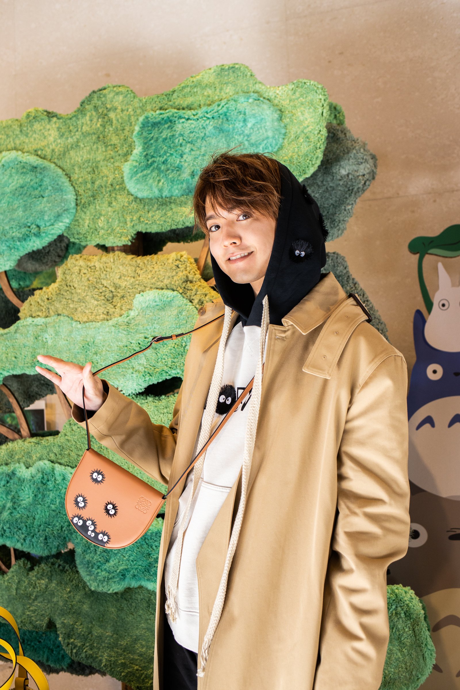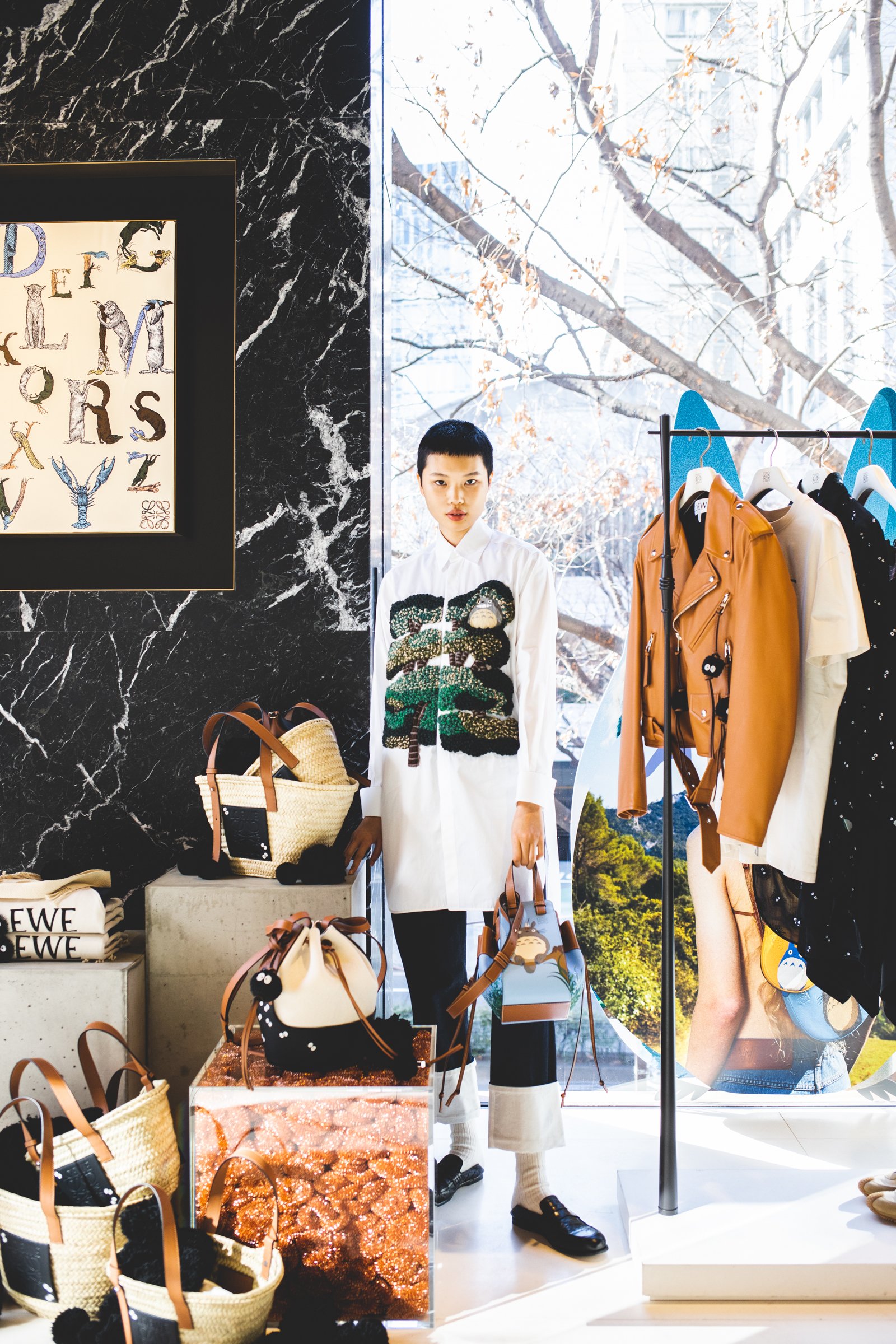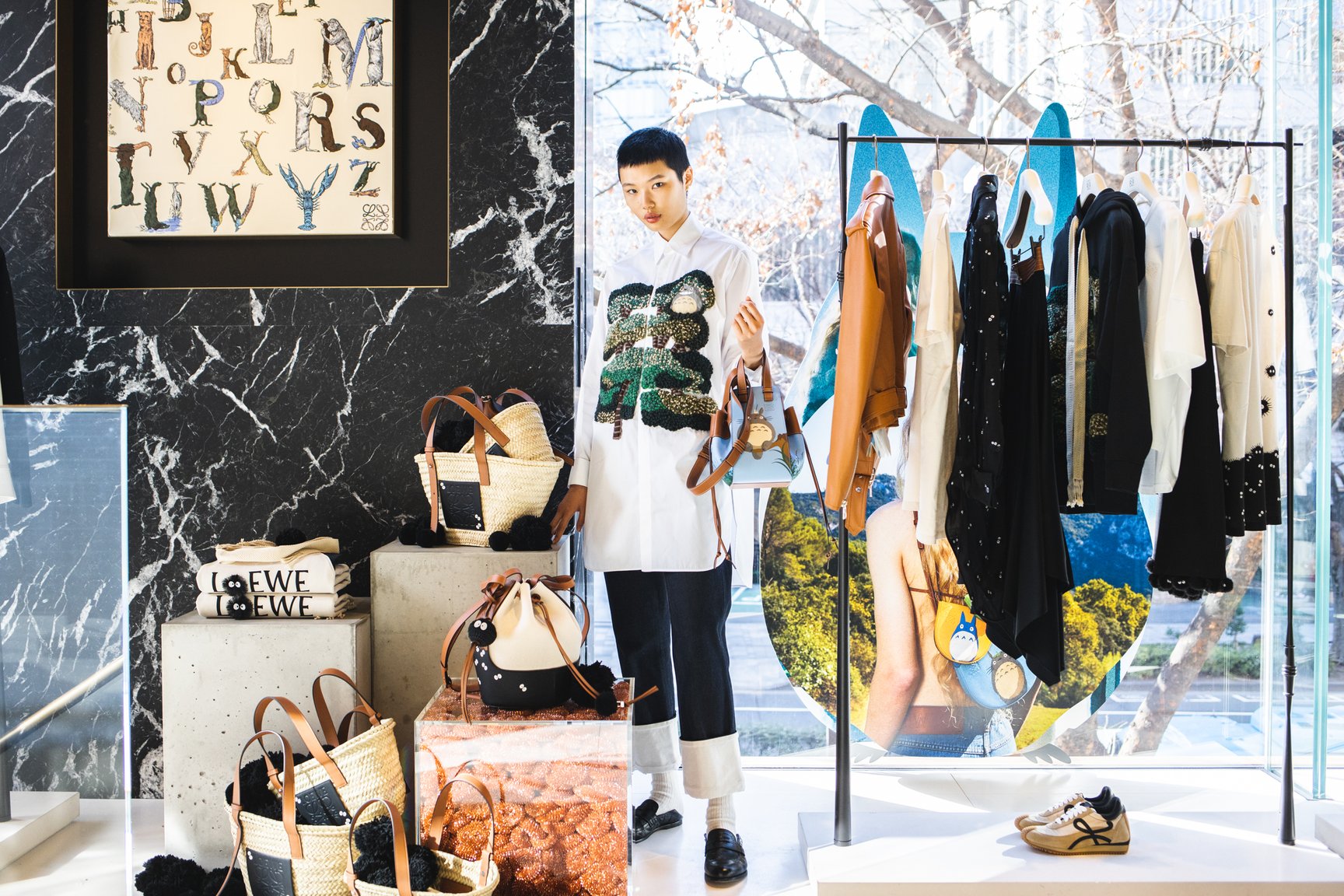 表参道店の店内にはクスの木やマックロクロスケをモチーフにしたディスプレイなどを設置し、となりのトトロの世界観を再現。2階には1月10日までの期間限定でトトロのイラストが展示されている。また、ロエベ全店でトトロのイラストが描かれたショッパー3サイズを数量限定で用意する。