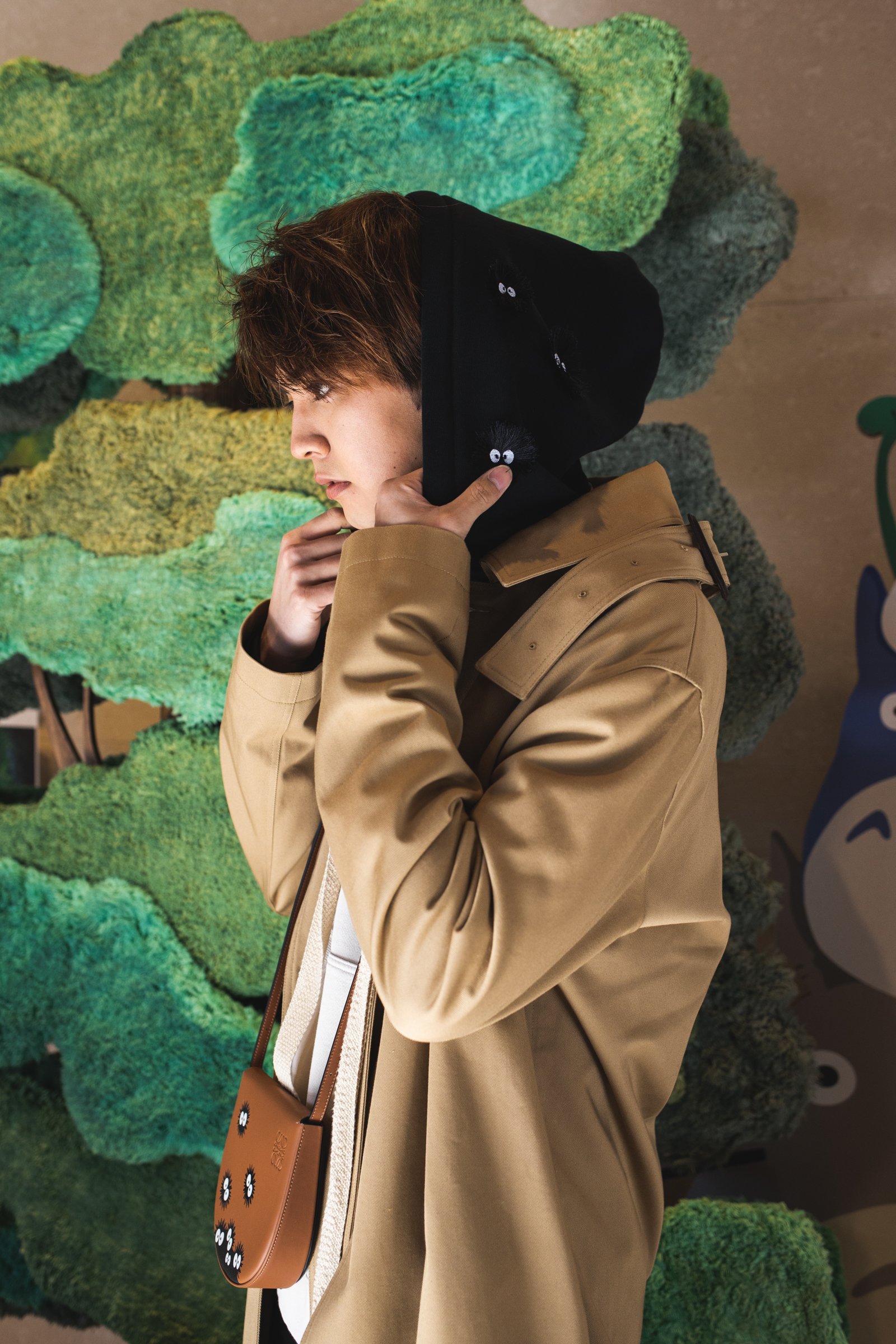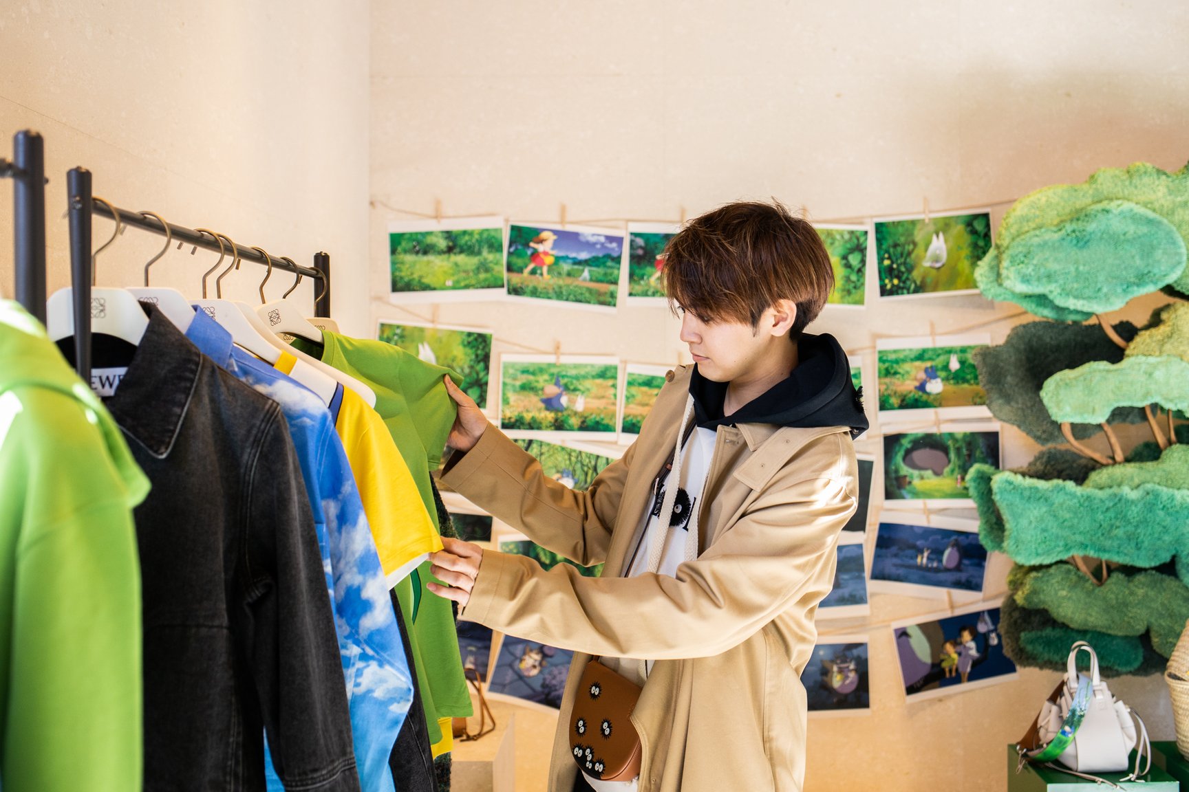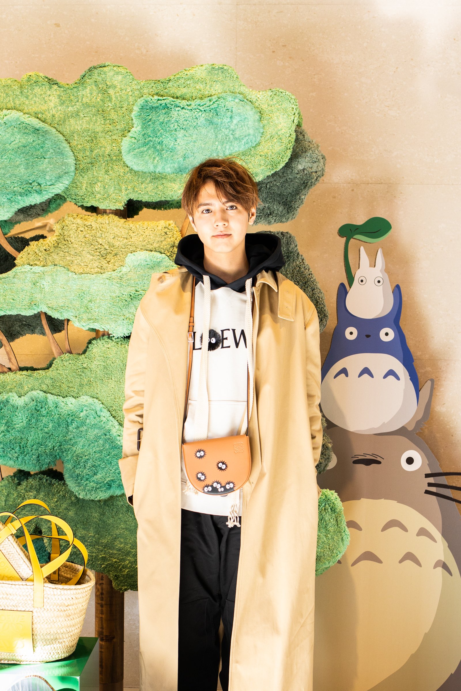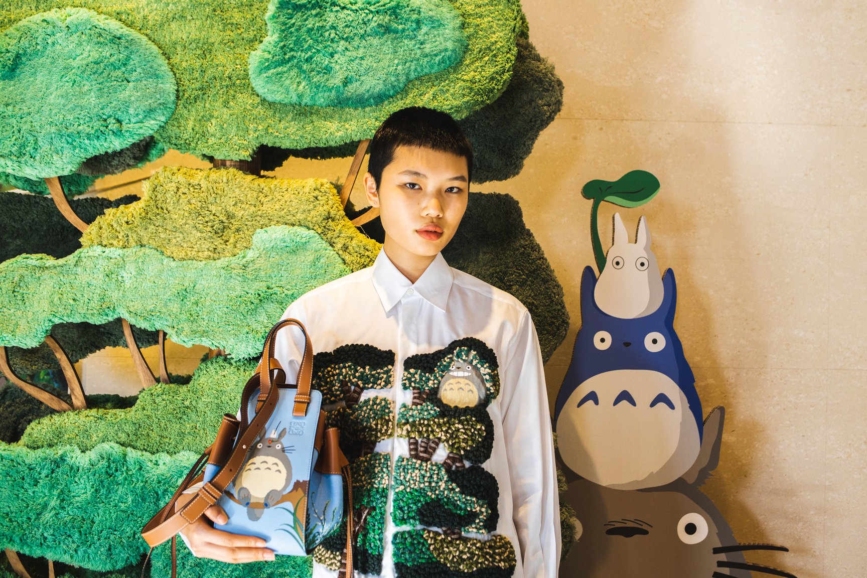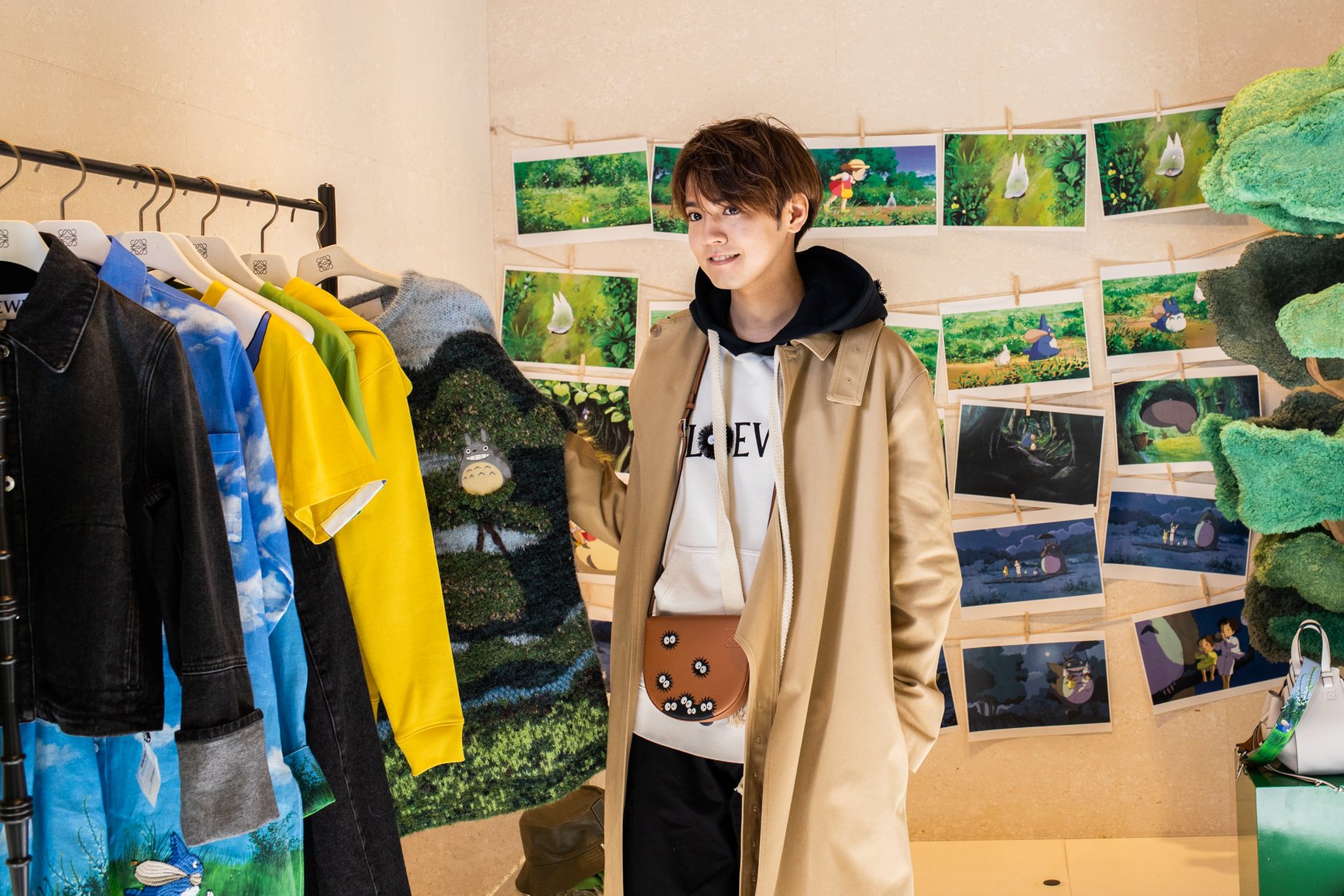 表参道店の店内にはクスの木やマックロクロスケをモチーフにしたディスプレイなどを設置し、となりのトトロの世界観を再現。2階には1月10日までの期間限定でトトロのイラストが展示されている。また、ロエベ全店でトトロのイラストが描かれたショッパー3サイズを数量限定で用意する。