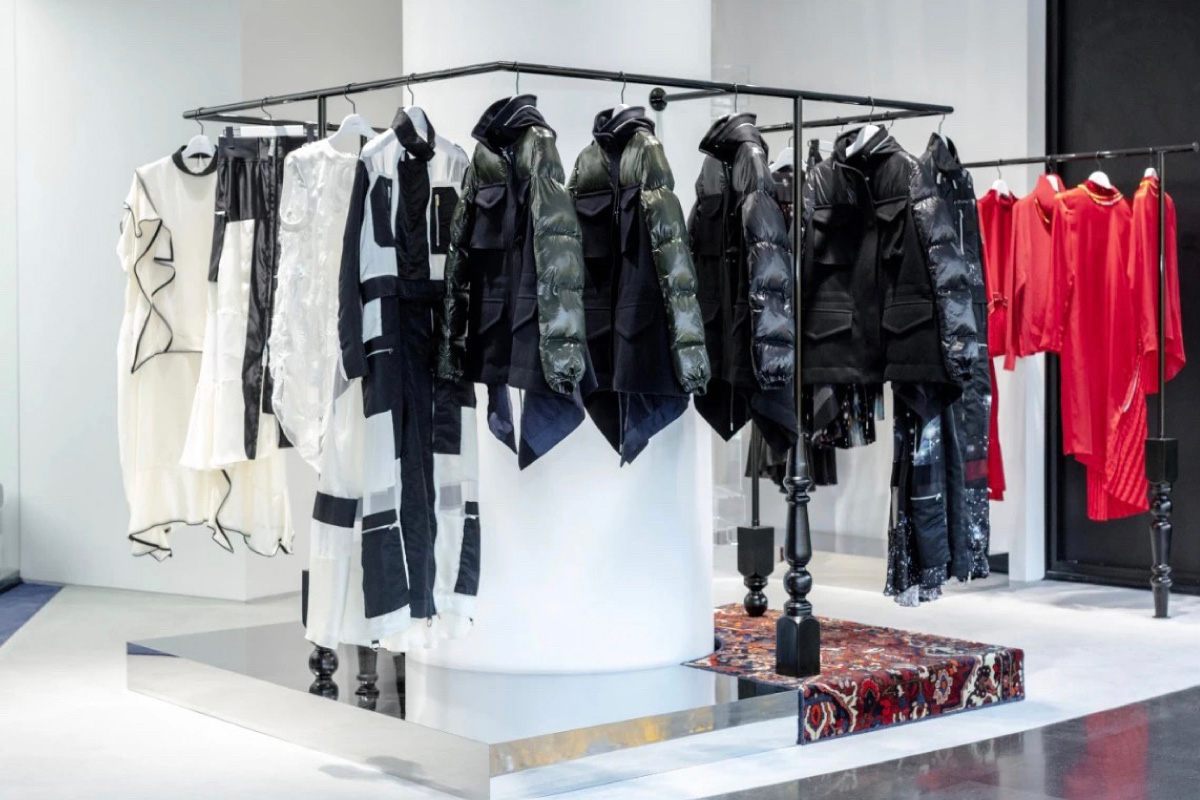 新店は、日本でも長期的な取り組みを続けているアートグループGELCHOPによるオーダーメイドの家具什器が使用されている。メンズレディース以外にも雑貨、カバン、靴なども取り扱い、sacaiの世界観を感じながらショッピングを楽しむことができる。