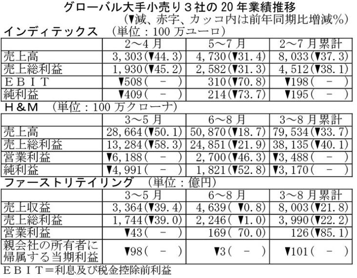 コロナ禍は3社の春物商戦を直撃したが、夏物商戦以降は減収幅が縮小し始めた。インディテックスは7月末に全店の96%が営業を再開、4月は7割減収だったが7月は17%減収となり、5~7月は黒字を確保した。H&Mも休業店舗数が8月末に200店まで減り、6~8月は2割弱の減収にとどまった。