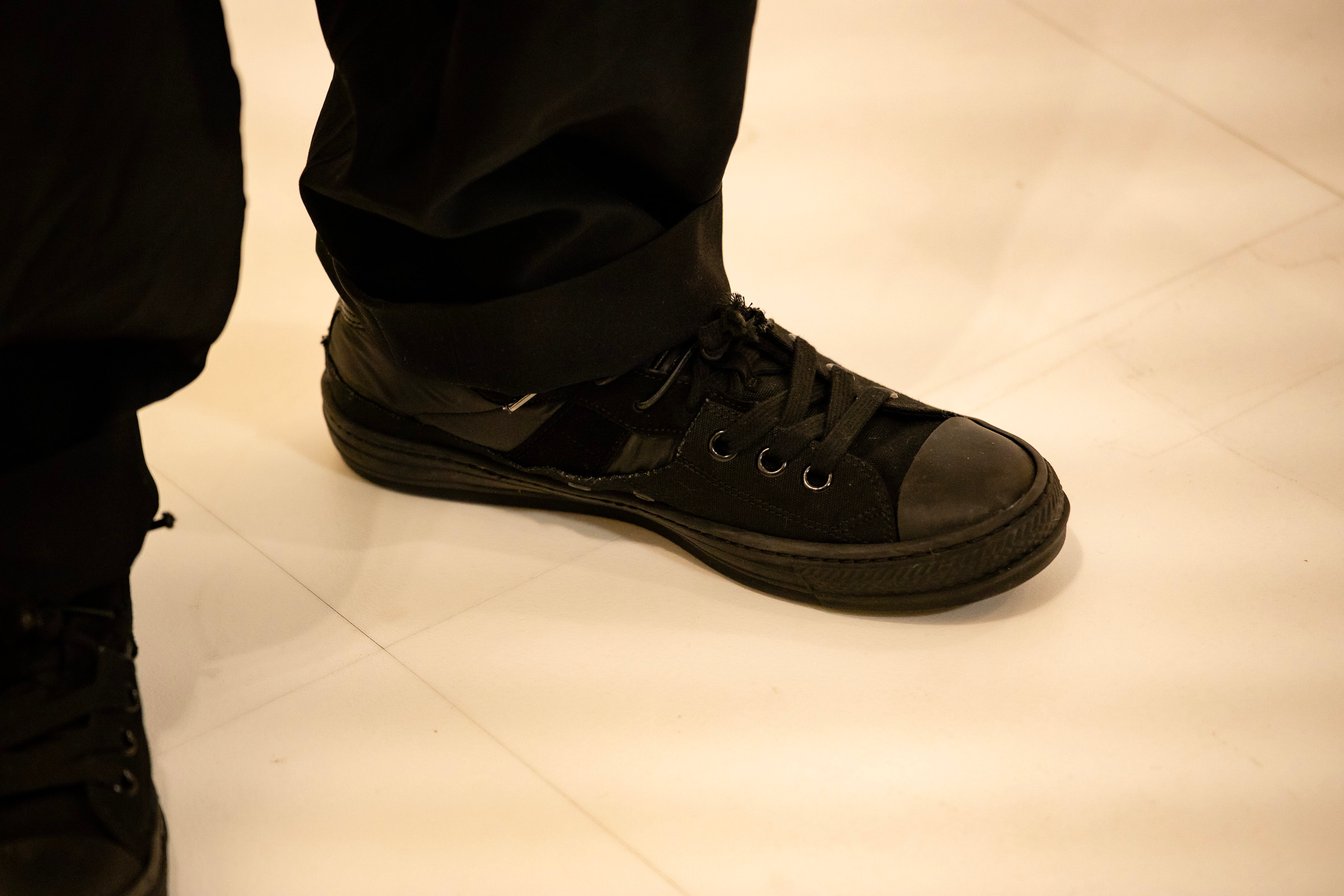 F:色は黒一色なので統一感はあるんですが、キャンバスとナイロン系の2つのスニーカーを前後でドッキングしたような形。解体と再構築の手法ですね。