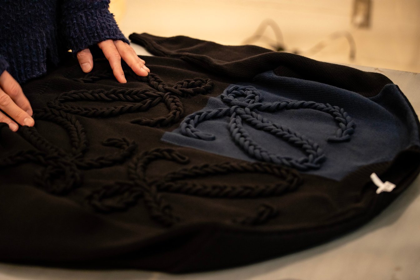 F:ロエベのセーター。サラッとした素材感で、よく見るとアナグラム(ロゴ)が編み込みになっていてすごく凝っています。