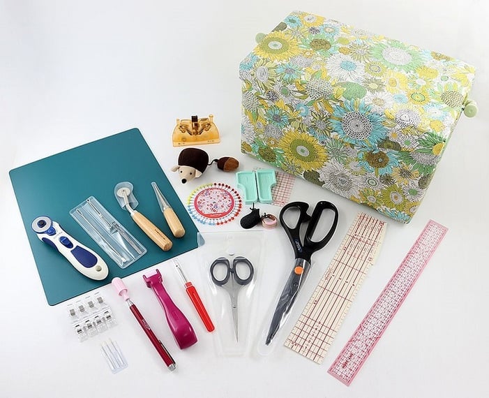 ソーイングセットの内容は、人気の「リバティ」プリント生地のソーイングボックスに、布切れ用や手芸用はさみ、方眼定規やアイロン定規、ワンプッシュで針に糸が通る糸通し器、重ねた布がサクッと切れるロータリーカッターなど、話題の便利グッズを含む20点。使い方ガイド付きで気軽に利用でき、手作りを楽しむ人を拡大するため往復送料無料で貸し出し中だ。