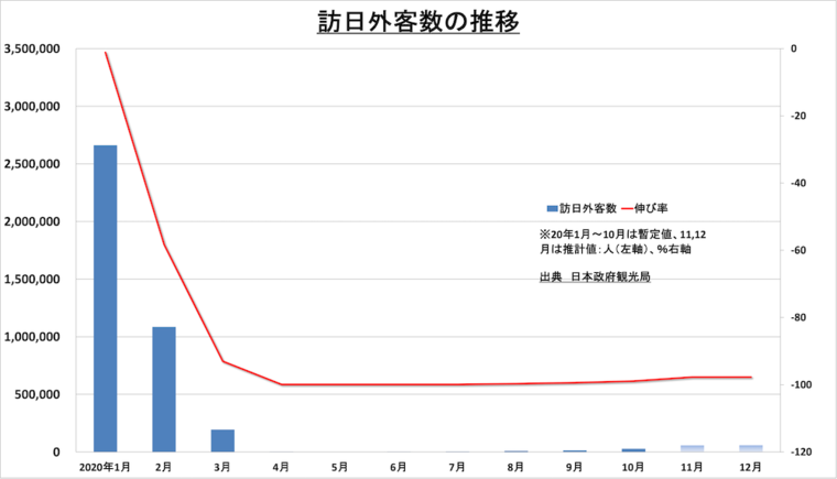 20年1月は266万1000人(前年同月比1.1%減)、2月は108万人(58.3%減)、3月は19万3600人(93%減)。4月以降も10月まではマイナス幅が拡大して、98~99.9%の減少。12月は97.7%減の5万8700人で、15カ月連続で前年同月を下回った。