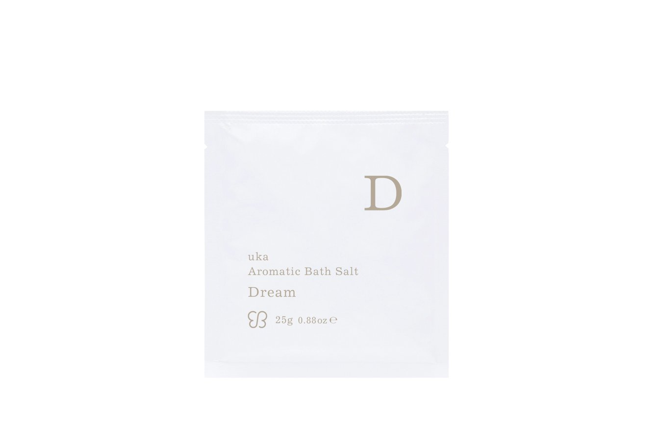 『uka アロマティックバスソルト ドリーム』は、フランキンセンスやプチグレン、マンダリンオレンジとラベンダー、マージョラムの香料をブレンド。