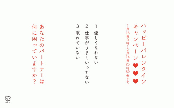 ukaでは、現在2月14日(日)までの期間限定で「ハッピーバレンタインキャンペーン」を実施中。
