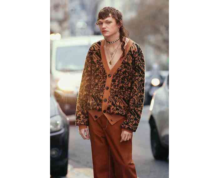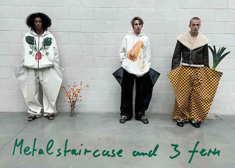 エチュードは様々な公共の場で踊り続ける人の映像を配信した。駅や公園、コインランドリーといった場所で、モデルたちが一心不乱に踊り続けるというシュールな演出。現場で音は流れていないのか、周りにいる人達も全くモデルに近づこうともしない。新作はカーキのMA-1やタイガー柄のカーディガン、ビッグサイズのケーブルセーター、タイダイ風パーカといったアイテム。ストリートの空気とともにレトロな雰囲気もはらんでいる。それは、テーパーのほとんど利いていないストレートパンツのシルエットのせいなのか。70年代や古着の雰囲気も感じさせる。