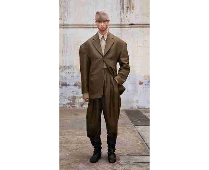 ヘッド・メイナーのフォルムはやっぱり面白い。淡々とモデルたちが登場して去っていく映像によって、カッティングの面白さが引き立った。ベージュや白のトーン・オン・トーンのコーディネートが軸になるが、そこにサイズ感やデコンストラクト(解体再構築)のテクニックを取り入れる。テーラードジャケットはビッグサイズでドロップショルダーが多いが、上襟は高く極端な肩傾斜を作るものもある。ケープのようなニットパーツも含めて、インナーのニットとデコンストラクトアウターが複雑に絡み合う着方も面白い。以前、フィジカルのファッションショーを見ていて、独特のセンスを感じていたが、もう一方で今一つコマーシャルに抜けきれないところがある。そこが市場にはまると一気にブレイクできるのかもしれない。