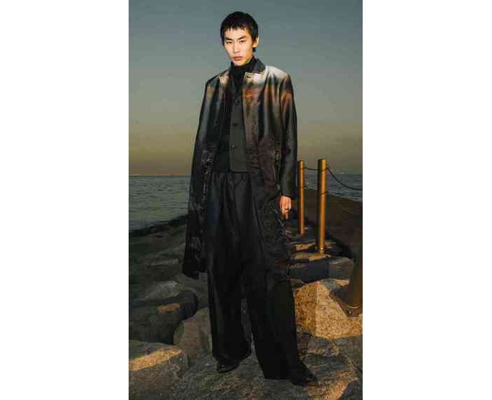 タークは初めてパリメンズの公式スケジュールに登場した。学生が新しい生活に向かう様子を思わせるショートムービーで新作を披露した。秋冬は光を感じさせるアイテムが揃う。型押しのようにトロンプルイユ襟を飾ったジャケット、ベルベットのカジュアルなセットアップ、艶やかなコンビネゾンといった光沢をのせたラインが興味深い。日の光を浴びてまぶしく映る花をのせたセットアップもロマンチック。70年代を感じさせる太めのストレートパンツやテーラード襟のショートブルゾンなど、ノスタルジックなムードを秘めたコレクションに仕上がった。