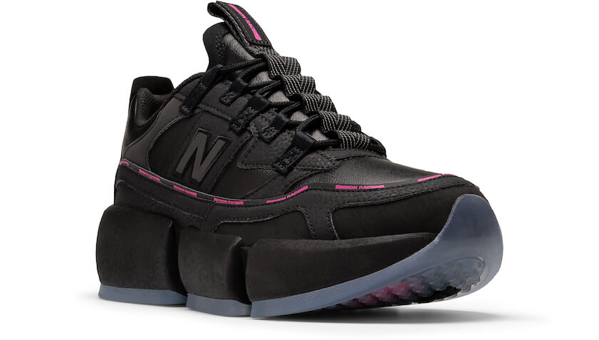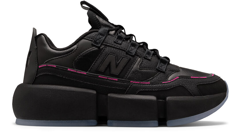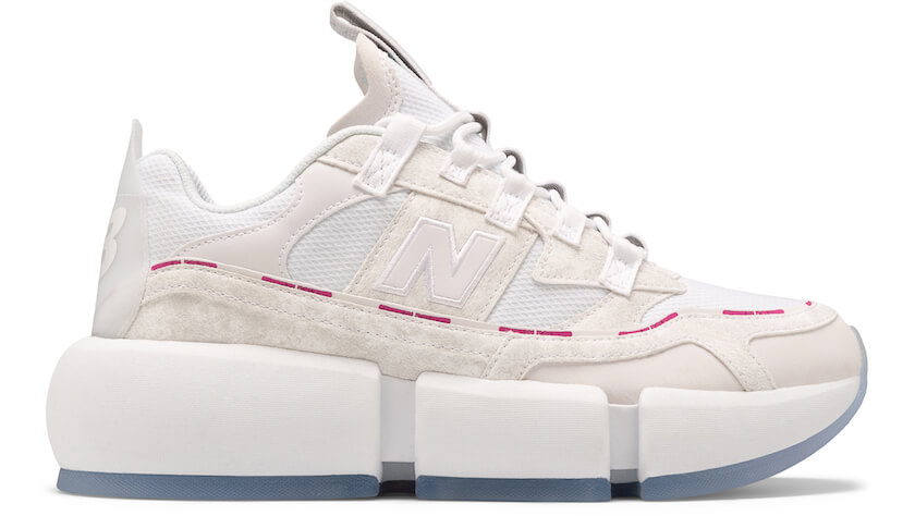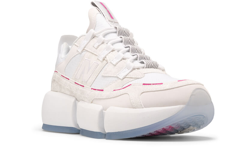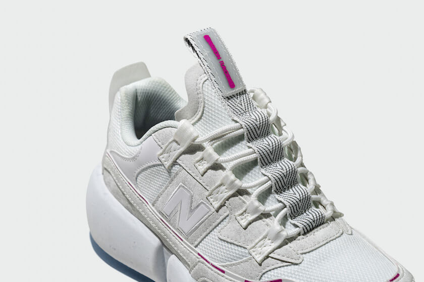 「Vision Racer」は、スポーティな「X-Racer」や人気の「M1700」といった、「ニューバランス」のフットウェアの中でジェイデンが気に入っているモデルをクリエーションの手がかりに、「ニューバランス」のベーシックデザインとジェイデンの現代的な美学が融合して誕生。各パーツには再生素材が一部取り入れられており、動物由来の製品を避けるヴィーガンにやさしいシューズとなっている。タンのウェビングテープに施されたリフレクターや、夜間でも視認されるNロゴとアッパーのパイピング、スケートボードなどジェイデンのアクティブでハイパフォーマンスなライフスタイルをサポートするために耐久性を高めた爪先のラバー加工、そして“VISION”がプリントされたボリューム感たっぷりのアイシーなアウトソールが特徴だ。今回発売される第4弾はホワイトとブラックの2色展開で、差し色のショッキングピンクがポイントとなっている。