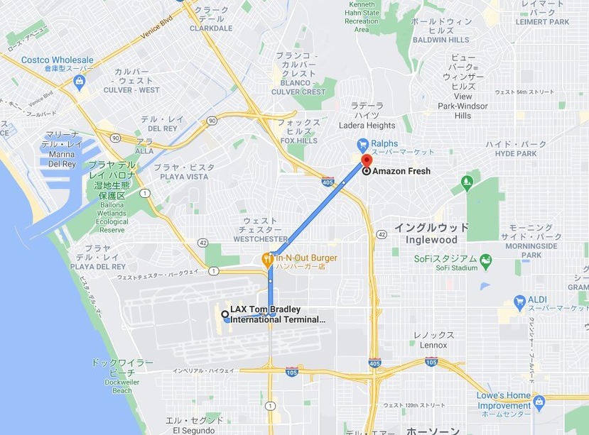 トム・ブラッドレー国際線ターミナルから移動車を使えば10分強でアマゾンの食品スーパーに行ける。空港を出発し南北に走るセプルベダ大通りに乗り換え、イン&アウトバーガーを左に見ながら、その先にあるラ・ティエラ大通りを右折して6分ほど進めば右手に見えてくる。