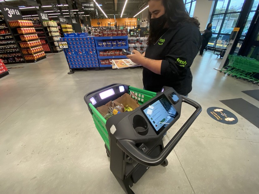 アマゾン・フレッシュといえばスマートショッピングカート「アマゾン・ダッシュカート(Amazon Dash Cart)」だ。