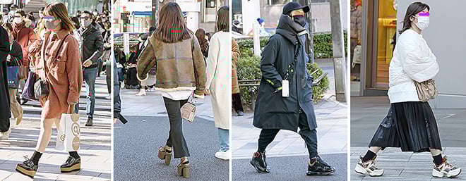 (写真左から順に)109系のティーンズたちはミニスカートで脚を出すのが基本スタイル。足元は厚底靴が定番(原宿)/真冬にも関わらず、超厚底のサンダルを着用した女性も散見された(原宿)/ハイテク感のあるボリュームスニーカーは圧倒的にNIKEのものが多い。こちらの男性はアウターやソックスもNIKEで統一(原宿)/ハイブランドとのコラボレーションも多いデザインスニーカーも目立った。こちらはパイソン柄(渋谷)。