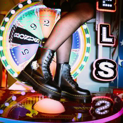 新作では、ハローキティをはじめリトルツインスターズやけろけろけろっぴ、マイメロディ、バッドばつ丸、ポムポムプリン、シナモンロールといったサンリオキャラクターのグラフィックを落とし込んだフットウェア4種をラインナップ。サイドとヒールにキャラクターのグラフィックを落とし込んだ8ホールブーツ(2万8000円)や厚底8ホールブーツ(3万2000円)、キャラクターを総柄であしらった3ホールシューズ(2万5000円)とジュニア8ホールブーツ(1万4000円/いずれも税別)が揃う。いずれのアイテムにも2種類のシューレースとハローキティの赤いリボンモチーフのチャームが付属する。