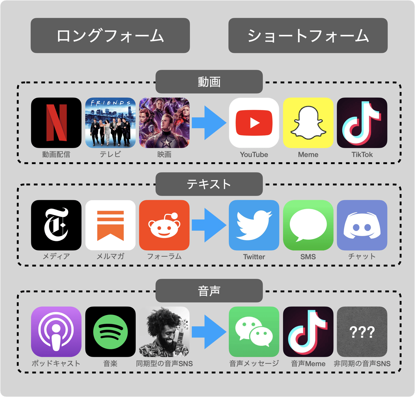 どのフォーマットもロングフォームから始まって、ショートフォームへシフトしていった。動画だと映画・テレビ・NetflixからYouTube・Meme・TikTokなどへ流れ、テキストだと大手メディア・新聞・メルマガ・フォーラムからTwitter・SMS・チャットへ変わってきた。音声の場合はポッドキャスト・音楽(Spotify)、そして最近だとClubhouseが入ってきて、音声メッセージ(WeChat)や音声Meme(TikTok)のシフトが行われている。ただ、その中でまだショートフォームへシフトしてないコンテンツフォーマットは、パブリックな非同期型のショートフォーム音声。いわゆる音声メッセージのSNS・UGCプラットフォーム。元々Anchorは音声版のTwitterとしてローンチしたが、結果としてポッドキャスト制作ツールへピボットした。音声メッセージが流行っている中、何故非同期の音声SNSが流行らないのでしょうか?非常に興味深い領域で、今後もしかしたら新しいSNSが入り込める市場かもしれない。