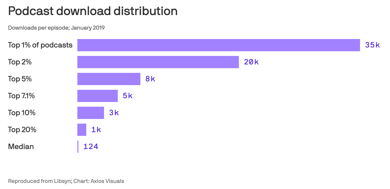 自動音声編集ツールのPodzコンテンツの書き起こしと音声化を行ったのは良いが、メルマガやロングフォームの記事を音声化するだけだと足りない。結局音声化しているだけだとポッドキャストのサプライを増やしているだけで、音声市場の最も高い課題を解決していない。ポッドキャスト(及び音声)業界での1番の課題はディスカバリー、いわゆるコンテンツが見つけにくいこと。ポッドキャストの数は増えているのに、未だに解決されないのがディスカバリー、いわゆる良いポッドキャストを見つける方法。今だとSpotifyとAppleのランキングやレコメンド、もしくは口コミでしか新しいポッドキャストと出会えない。実際にポッドキャストのダウンロード実績を見ると、トップ1%のポッドキャストは平均3.5万ダウンロードがあるが、トップ20%のポッドキャストだと各エピソードは平均1,000ダウンロードしか取れない。中央値は124ダウンロードなので、これだと良いポッドキャストを作っても、結果として誰も聞いてくれない。