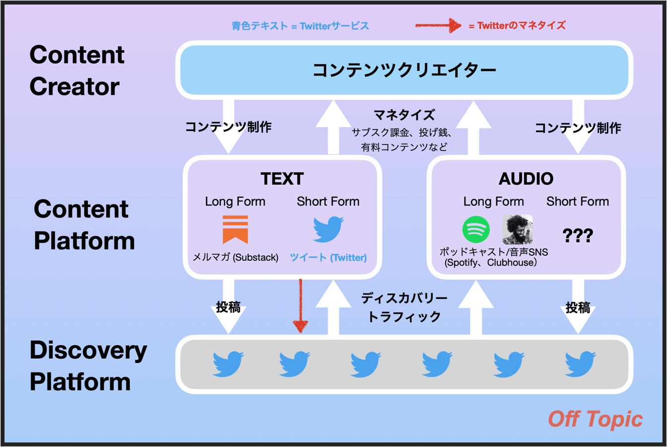 今現在のTwitterはSubstack、Spotify、Clubhouseなどコンテンツプラットフォームのディストリビューション・ディスカバリーツールでしかない。そうなるとTwitterはプラットフォームとしては重要な立場であるものの、上手くマネタイズが出来ない。さらに、クリエイターと直接繋がることが難しくなる。図にすると以下のような形となる。