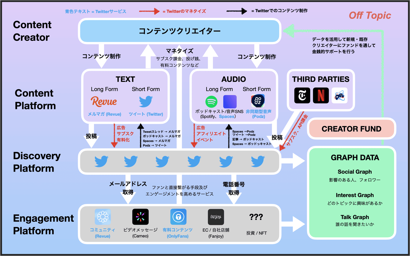 コンテンツクリエイターと繋がるとクリエイターとファンのエンゲージメントプラットフォームを作ることが出来る。ここではコミュニティ、ビデオメッセージ、クリエイターへの投資など様々な可能性が生まれる。そして全てのデータをTwitterはソーシャルグラフ、興味グラフ、そしてトークグラフとして集計して、そのデータを元にクリエイターファンドを通して新・既存クリエイターへ金銭的支援をすることで全体像の循環が加速する。