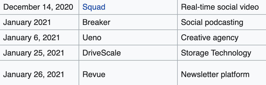 昔はTwitterは多くの会社を買収していた。2011年から2015年の間で44社買収していたのが、2016年では3社、2017年では0社、2018年では1社、2019年では3社、そして2020年では3社とペースダウンしている。そんなTwitterだったが、2020年12月と2021年1月の買収履歴を見てみると、