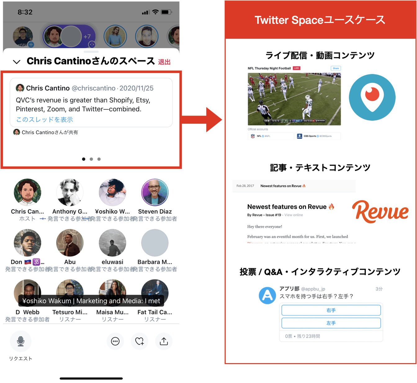 今出せる絵文字は5つしかない:💯🤚✊✌️👋絵文字を増やすリクエストはかなり多いらしく、モデレーター・スピーカー側とするとどの話が響いているかが分かりやすくて高評価。ベータ版であまり広がっていないからかもしれないが、Twitter Spacesユーザーにヒアリングしたところ、Clubhouseより小さい部屋で友達同士で話しているイメージがあると言っている。重要なのはツイートの表示、書き起こし、絵文字リアクションは全て音声以外のインタラクション機能・方法なのが、Twitter SpaceとClubhouseの根本的な違いとなります。そうするとTwitterはもしかしたらClubhouseと最初だけ競合して、最終的にはTwitch、Zoom、イベントサービスと競合する形になるかもしれない。Color CapitalのChris Cantinoさんが予測するには、以下のようなユースケースがTwitter Spacesだと考えられる: