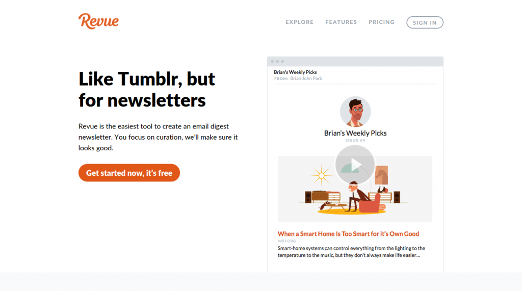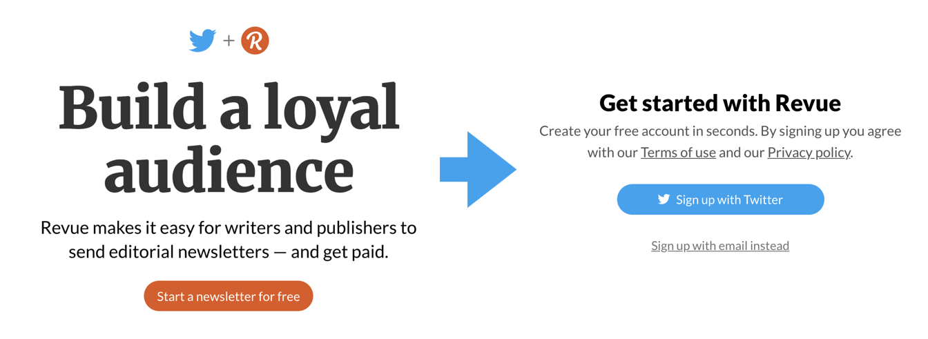 Twitterとの連携方法Twitterが本気でメルマガ配信サービスを既存プロダクトに埋め込むと、色んな可能性が生まれる。まずTwitterは既にメールアドレス情報を持っているため、メルマガを作るのがワンクリックで出来るようになる。実際にRevueとはこの実装が既に完了している。Revueのホームページにいって「Start a newsletter for free」をクリックすると、Twitterで登録が出来るようになっている。